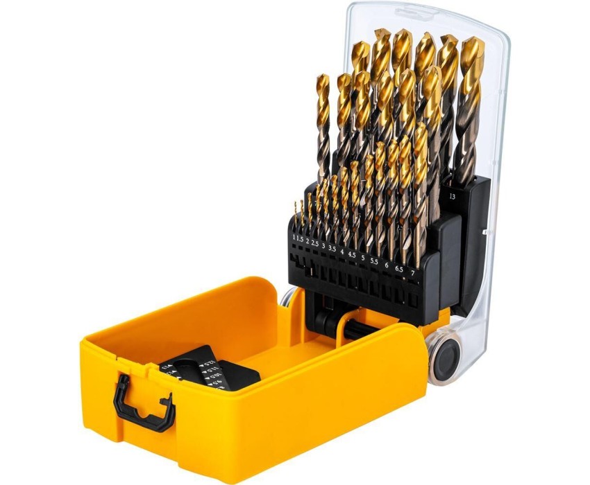 Набор Denzel Golden Tip 723010 состоит из 25 сверл по металлу диаметром 1-13 мм, изготовленных из стали P6M5K8. Угол заточки составляет 135°, что позволяет получать чистые и ровные отверстия в закаленной и нержавеющей стали, цветных и черных металлах, а также жестком пластике. Сверлам присвоен класс точности A1, что гарантирует высокое качество выполняемых работ. Оснастка характеризуется пониженным коэффициентом трения, что облегчает сверление и улучшает отвод стружки. Набор будет полезен дома и в мастерской.