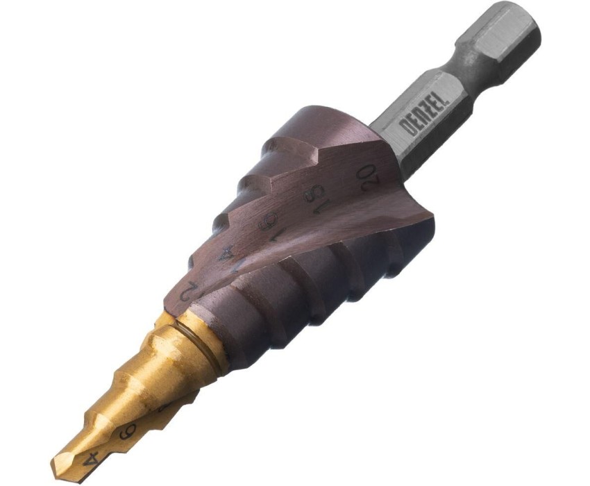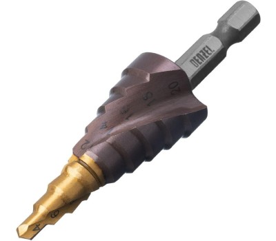 Сверло DENZEL Сверло ступенчатое 4-6-8-10-12-14-16-18-20 мм, Р6М5К5, 6-гр. хвостовик 723613