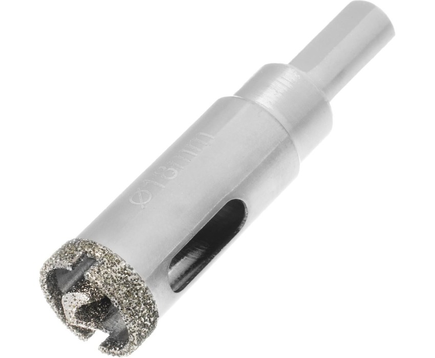 Универсальное алмазное сверло по керамограниту Matrix 726183 размером 18 х 67 мм, с 3-гранным хвостовиком, применяется для получения отверстий в стекле, плитке, кафеле. За счет высокой концентрации алмазов в режущем слое оно легко справляется со сверлением керамогранита. Сверло рассчитано на профессиональное использование с дрелями и шуруповертами. Водяное охлаждение в процессе работы значительно повышает срок службы оснастки. Преимущества Высокий ресурс — сверло с усиленным корпусом и увеличенным алмазным слоем долго сохраняет рабочие свойства. Антикоррозионное покрытие — при мокром сверлении на сверле не образуется ржавчина. Легкое засверливание — благодаря центрирующему сверлу коронку не уводит в сторону. Надежная фиксация — трехгранный хвостовик не прокручивается в патроне дрели или шуруповерта.