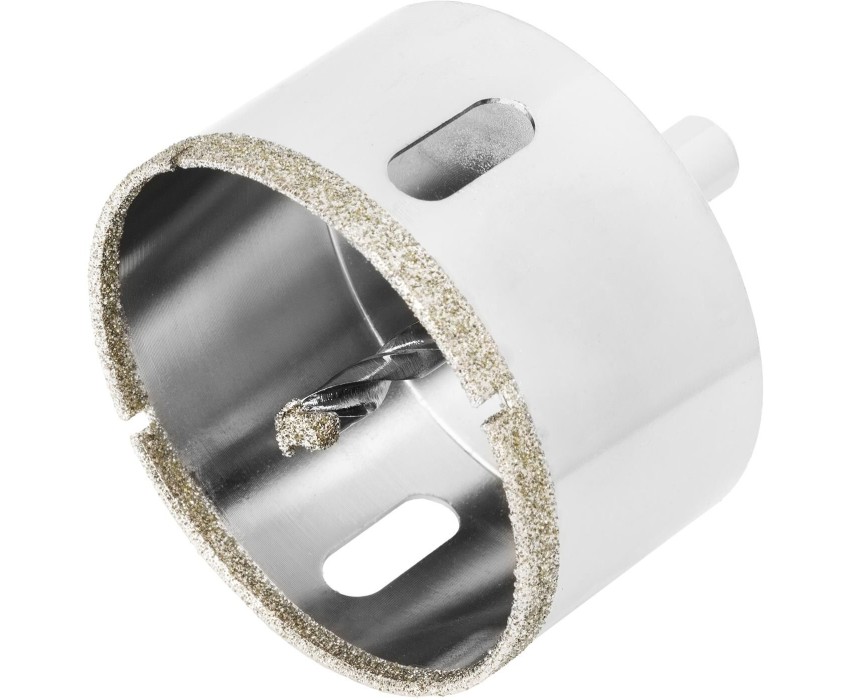 Универсальное алмазное сверло по керамограниту Matrix 726703 размером 70 х 67 мм, с 3-гранным хвостовиком, применяется для получения отверстий в стекле, плитке, кафеле. За счет высокой концентрации алмазов в режущем слое оно легко справляется со сверлением керамогранита. Сверло рассчитано на профессиональное использование с дрелями и шуруповертами. Водяное охлаждение в процессе работы значительно повышает срок службы оснастки. Преимущества Высокий ресурс — сверло с усиленным корпусом и увеличенным алмазным слоем долго сохраняет рабочие свойства. Антикоррозионное покрытие — при мокром сверлении на сверле не образуется ржавчина. Легкое засверливание — благодаря центрирующему сверлу коронку не уводит в сторону. Надежная фиксация — трехгранный хвостовик не прокручивается в патроне дрели или шуруповерта.