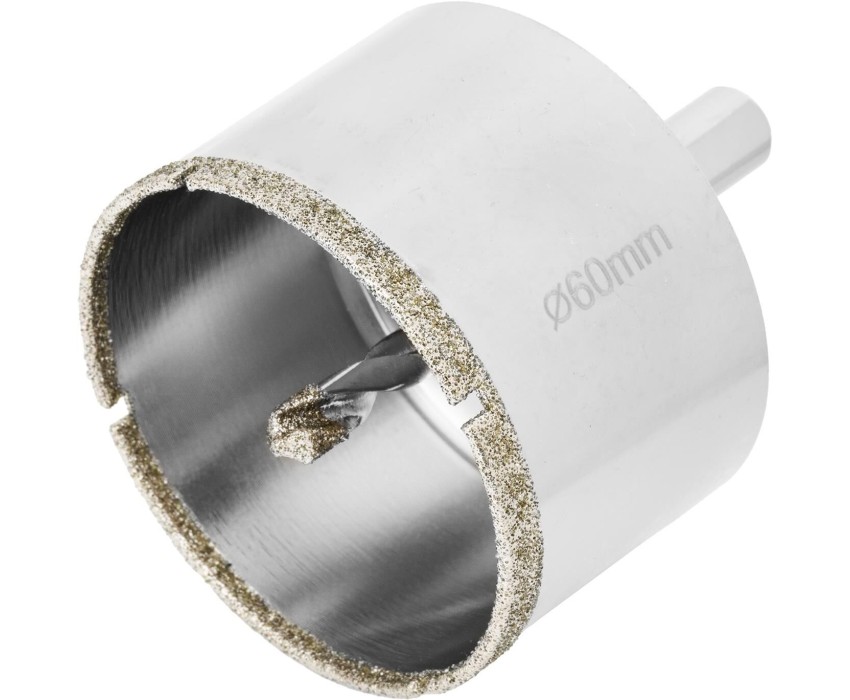 Универсальное алмазное сверло по керамограниту Matrix 726603 размером 60 х 67 мм, с 3-гранным хвостовиком, применяется для получения отверстий в стекле, плитке, кафеле. За счет высокой концентрации алмазов в режущем слое оно легко справляется со сверлением керамогранита. Сверло рассчитано на профессиональное использование с дрелями и шуруповертами. Водяное охлаждение в процессе работы значительно повышает срок службы оснастки. Преимущества Высокий ресурс — сверло с усиленным корпусом и увеличенным алмазным слоем долго сохраняет рабочие свойства. Антикоррозионное покрытие — при мокром сверлении на сверле не образуется ржавчина. Легкое засверливание — благодаря центрирующему сверлу коронку не уводит в сторону. Надежная фиксация — трехгранный хвостовик не прокручивается в патроне дрели или шуруповерта.