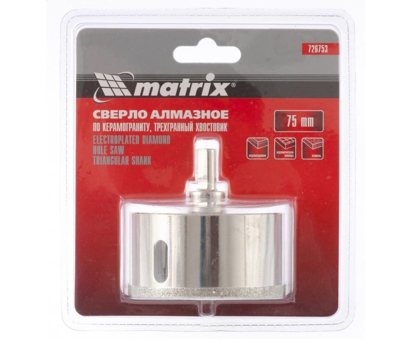 Универсальное алмазное сверло по керамограниту Matrix 726753 размером 75 х 67 мм, с 3-гранным хвостовиком, применяется для получения отверстий в стекле, плитке, кафеле. За счет высокой концентрации алмазов в режущем слое оно легко справляется со сверлением керамогранита. Сверло рассчитано на профессиональное использование с дрелями и шуруповертами. Водяное охлаждение в процессе работы значительно повышает срок службы оснастки. Преимущества Высокий ресурс — сверло с усиленным корпусом и увеличенным алмазным слоем долго сохраняет рабочие свойства. Антикоррозионное покрытие — при мокром сверлении на сверле не образуется ржавчина. Легкое засверливание — благодаря центрирующему сверлу коронку не уводит в сторону. Надежная фиксация — трехгранный хвостовик не прокручивается в патроне дрели или шуруповерта.