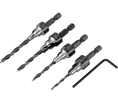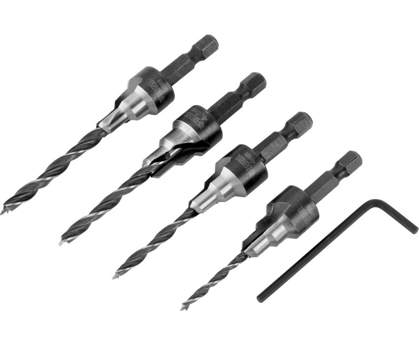 Набор сверл под конфирмат Denzel 704240 включает 4 оснастки диаметром 3-5 мм, предназначенные для получения отверстий под евровинты в древесине, фанере и ДСП. Сверла устанавливаются в патрон электрической дрели или сверлильного станка и подходят для конфирматов размером 4 х 50, 5 х 50, 6 х 50 и 7 х 50 мм. Набор используется в мебельном производстве. Преимущества Прочность и долговечность — оснастка изготовлена из инструментальной стали, рабочие кромки твердостью 48-52 HRC долго сохраняют режущую способность. Высокое качество сверления — сверла с оптимальной заточкой и идеально подобранной геометрией ступеней позволяют получить чистые и точные отверстия. Надежная фиксация — шестигранные хвостовики не проворачиваются в патроне. Универсальность — в набор входят сверла для конфирматов наиболее популярных размеров.