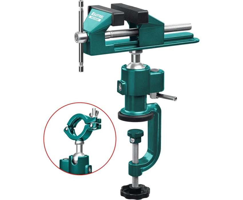 Профессиональный шарнирно-поворотный инструмент с ручным приводом для выполнения точных работ Преимущества Надёжное закрепление детали сложной формы под любым углом Губки со съемными нескользящими резиновыми накладками, позволяющими контролировать степень зажима, избегая при этом повреждения поверхности закрепляемой детал Канавки на подвижной губке обеспечивают удобство крепления круглых деталей Основание, закрепленное на шарнире, позволяет поворачивать корпус тисков под различными углами и фиксировать его в необходимом положении зажимными винтами Возможность быстрой замены корпуса тисков на зажим для дрели с помощью HEX- винта Основание корпуса тисков имеет резиновую прокладку (подошву), предохраняющую установочную поверхность от повреждений Быстрая и надежная установка тисков на столе осуществляется с помощью струбцины Эмалированный корпус и хромированное покрытие крепежных винтов из холоднокатанной стали обеспечивают длительный срок службы Корпус тисков представляет собой цельнолитую алюминиевую конструкцию Использование Для зажима различных предметов или их отдельных составных элементов