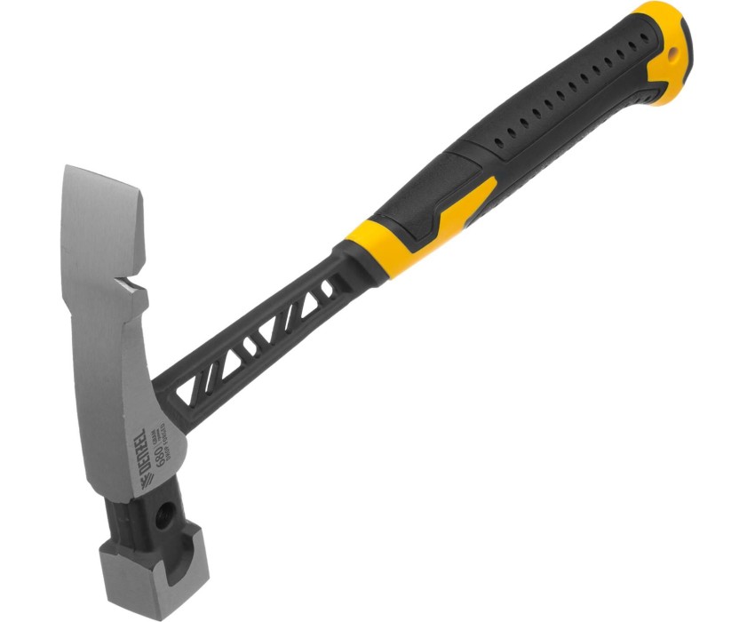Цельнокованый молоток каменщика Denzel 10633 с бойком весом 680 г, с двухкомпонентной обрезиненной рукояткой, используется для выполнения работ с каменной или кирпичной кладкой. Квадратный боек предназначен для нанесения ударов, а удлиненный заточенный носок — для разрубания камня или кирпича. Гвоздодер применяется для выпрямления небольших гвоздей. Преимущества Прочность — головка изготовлена из среднеуглеродистой стали 45, цельнокованый корпус исключает поломку или повреждение рукоятки. Высокий ресурс — твердость бойка составляет 50-55 HRC, поэтому он сохраняет рабочие качества даже при интенсивном использовании. Функциональность — в теле головки имеется отверстие для выгибания прутков и гвоздей. Комфортная работа — двухкомпонентная рукоятка с резиновыми вставками и рифленой поверхностью не выскальзывает из ладони и уменьшает нагрузку на руку мастера.