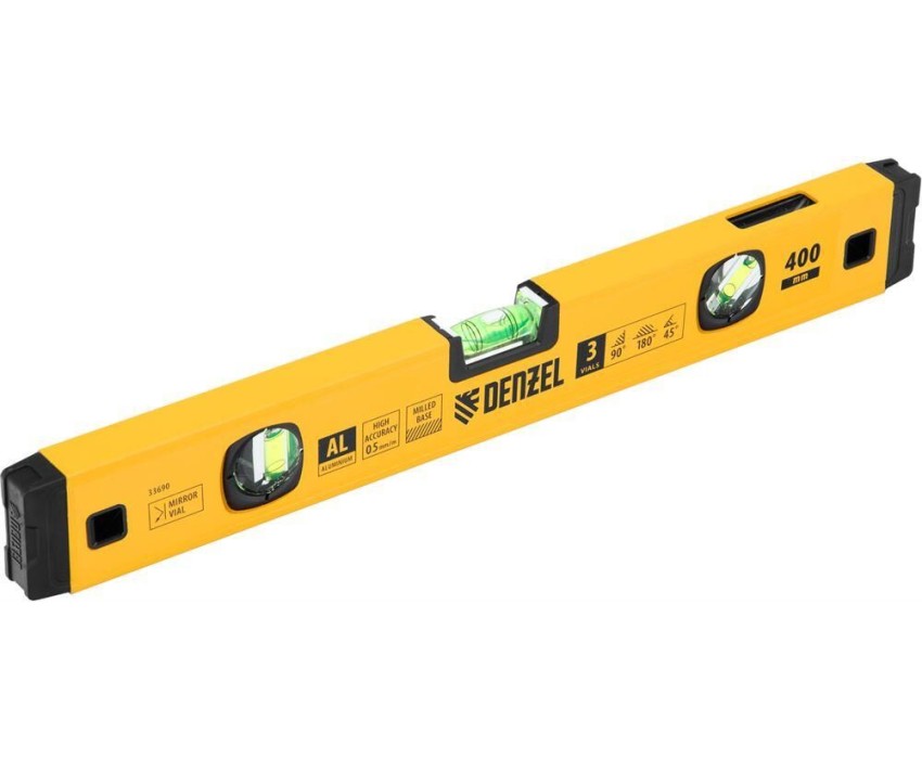Алюминиевый фрезерованный уровень Denzel 33690 длиной 400 мм, с магнитом и 3 глазками, из которых 1 зеркальный, предназначен для контроля отклонений от горизонтальной, вертикальной и поверхности под углом 45° с точностью 0,5 мм/м. 3 пузырьковые камеры 90°, 180° и 45° позволяют быстро проверить правильность разметки. Инструмент незаменим при проведении строительных, ремонтных, сантехнических работ. Преимущества Надежность и долговечность — корпус выполнен из прочного алюминиевого сплава. Простая фиксация на стальных поверхностях — уровень оснащен встроенными магнитами. Комфортная эксплуатация — пузырьковая камера 90° с зеркальным отражателем облегчает работу с вертикальными поверхностями. Точная работа — базовая поверхность фрезерована, что позволяет минимизировать погрешность. Удобное хранение — в корпусе предусмотрено отверстие для подвешивания инструмента. Для определения отклонения вертикали 90° необходимо использовать пузырьковую ампулу только в верхнем положении уровня. Рабочей является только базовая поверхность (противоположная ампуле 180°).