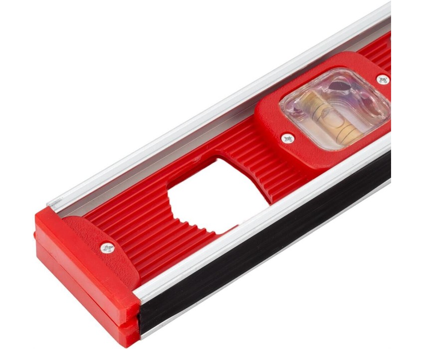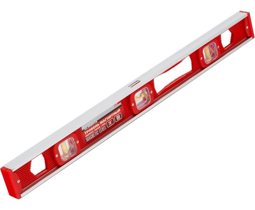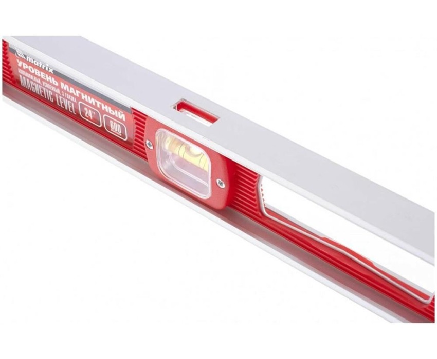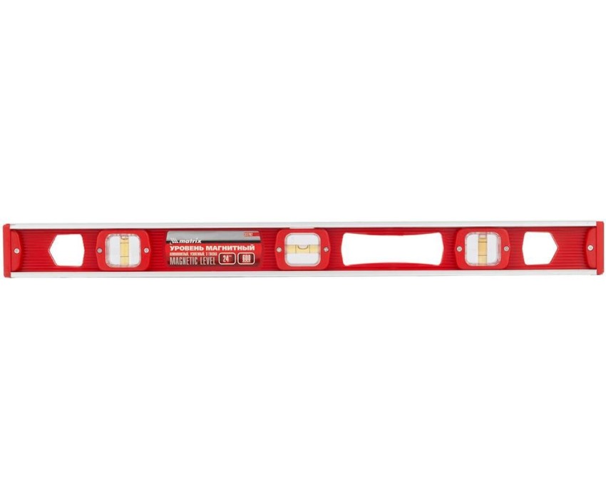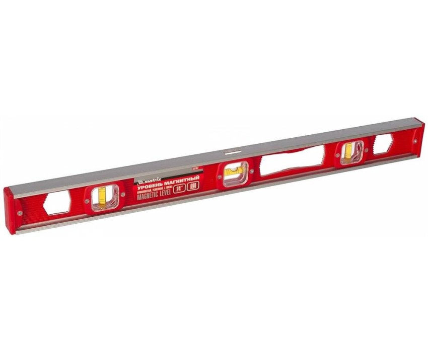 Магнитный уровень Matrix 33702 длиной 600 мм, с 3 глазками, — измерительный инструмент для проверки горизонтальных и вертикальных поверхностей. Пригодится на строительной площадке или в быту для выравнивания поверхностей, при монтаже конструкций, отделке помещений и выполнении других операций. Погрешность не превышает 1 мм на каждый метр (0,057°). Преимущества Надежная конструкция — корпус выполнен из пластмассы и легкого, но прочного алюминиевого каркаса. Удобная фиксация на металлических поверхностях — уровень снабжен встроенными магнитами. Защита от пыли и мелкого мусора — на торцах корпуса имеются пластиковые заглушки. Эргономичность — благодаря отверстию в корпусе уровень удобно удерживать. Для определения отклонения вертикали 90° необходимо использовать пузырьковую ампулу только в верхнем положении уровня. Только базовая поверхность (противоположная ампуле 180°) является рабочей.
