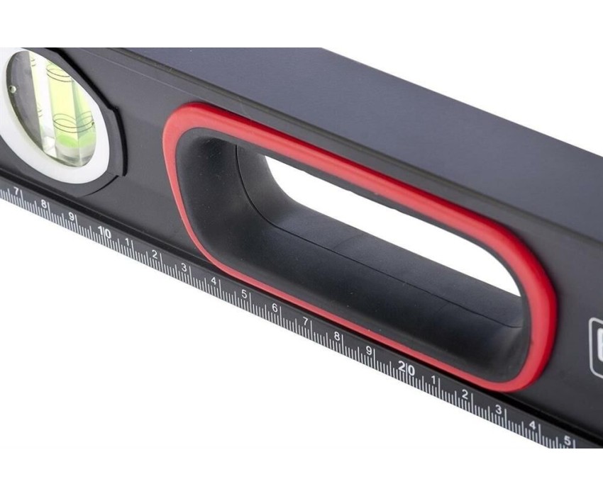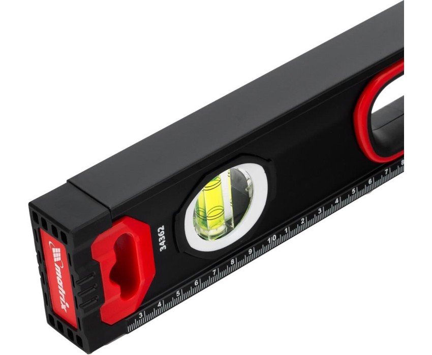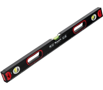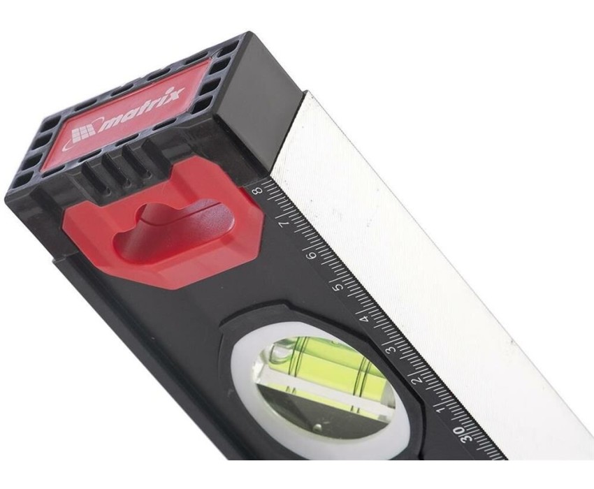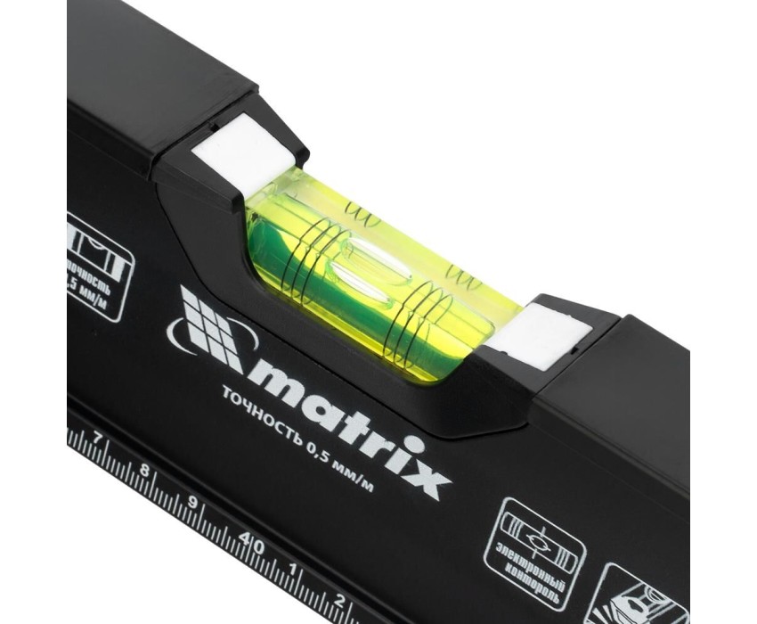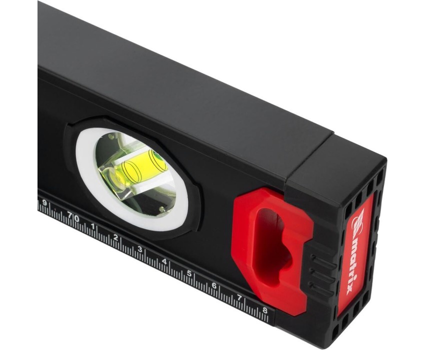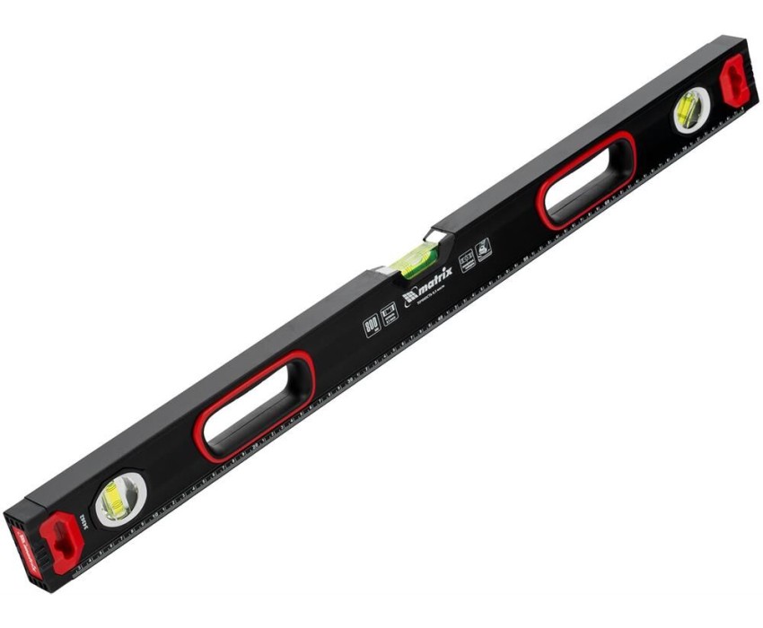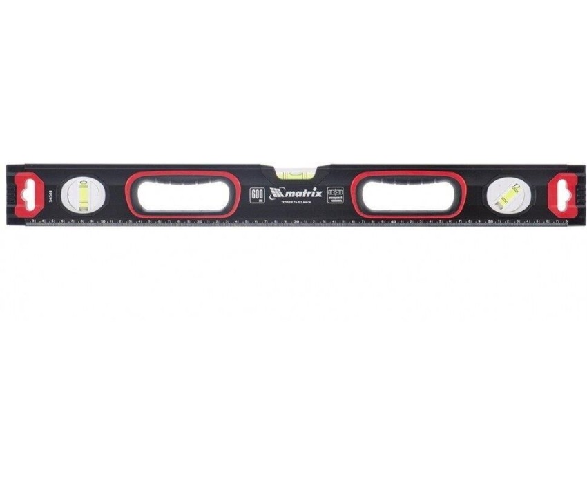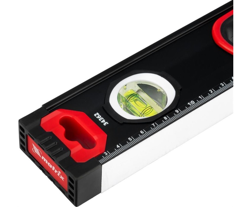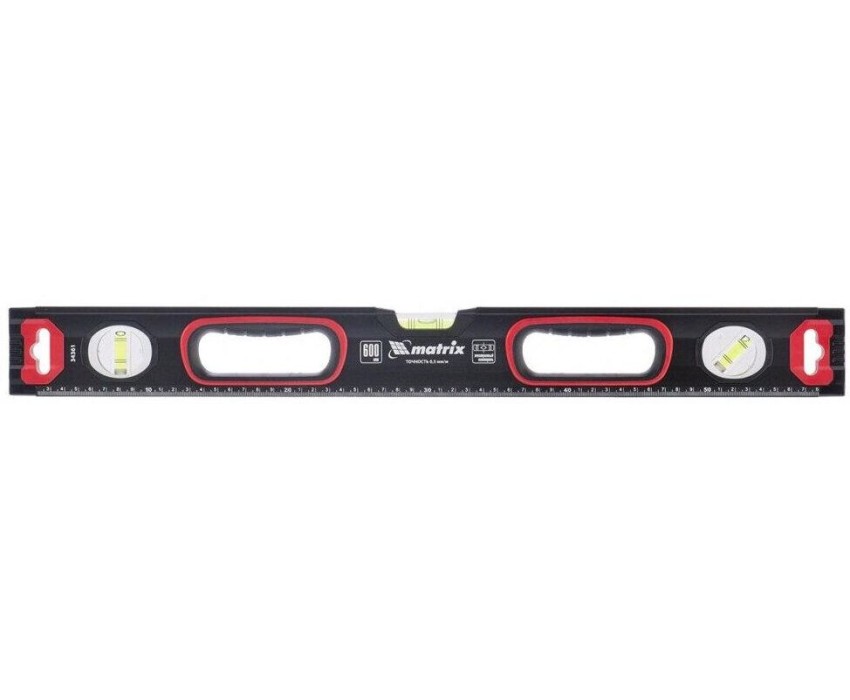 Уровень алюминиевый усиленный Matrix 34362 длиной 800 мм, фрезерованный, с 3 глазками и двухкомпонентными рукоятками, служит для проверки горизонтальных, вертикальных поверхностей, а также точности угла 45°. Пригодится частному мастеру и профессионалу для проведения строительных, ремонтных и монтажных работ. Преимущества Легкая и прочная конструкция — уровень выполнен из алюминиевого профиля. Высокая точность выполняемых работ — глазки прошли электронную калибровку, базовая поверхность фрезерована. Удобный захват — в корпусе имеются рукоятки с прорезиненными вставками. Дополнительные возможности — измерительная шкала позволяет использовать инструмент в качестве линейки. Для определения отклонения вертикали 90° необходимо использовать пузырьковую ампулу только в верхнем положении уровня. Только базовая поверхность (противоположная ампуле 180°) является рабочей.