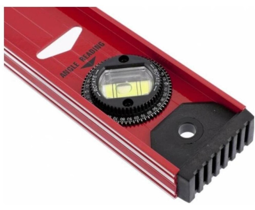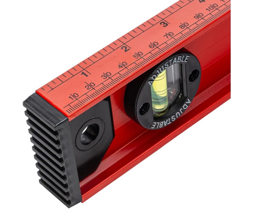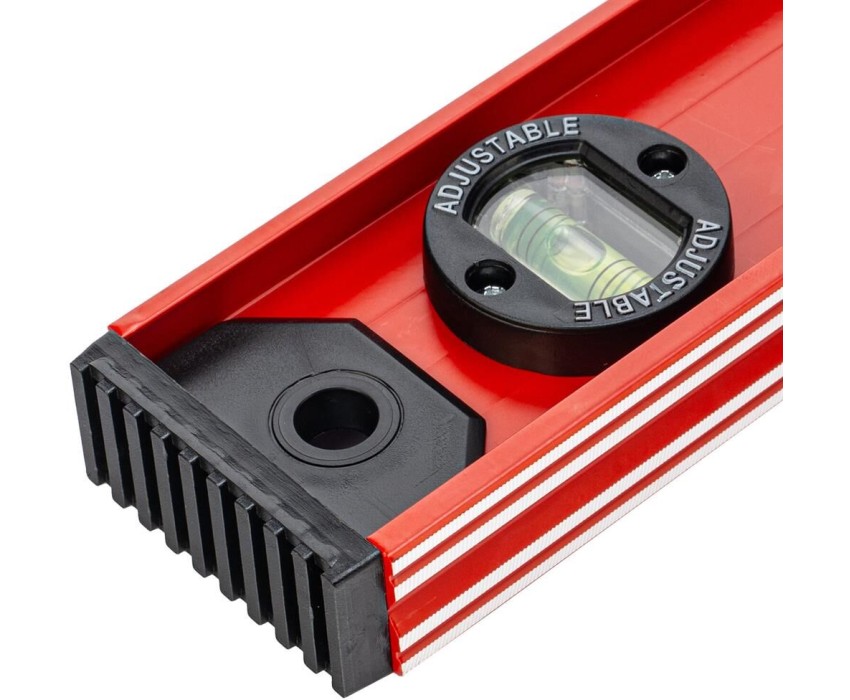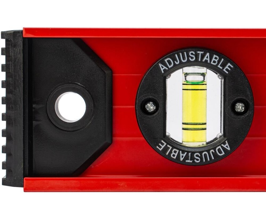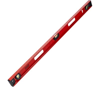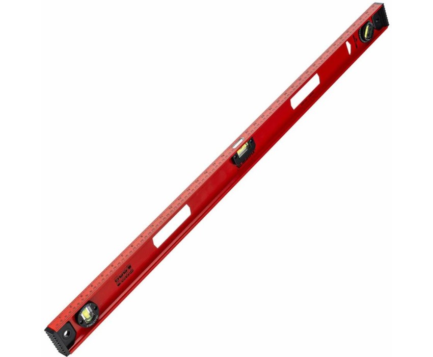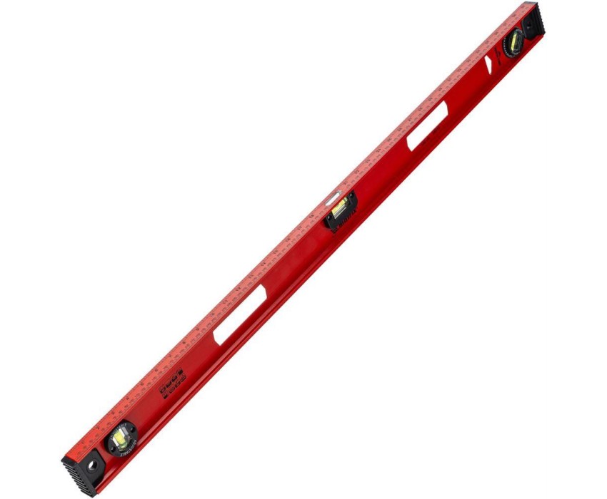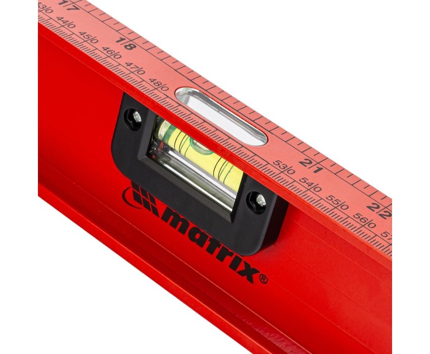 Уровень алюминиевый усиленный Matrix «Рельс» 34010 длиной 1000 мм снабжен 3 глазками для проверки отклонений относительно горизонтальной и вертикальной плоскостей. Поворотный глазок уровня позволяет выстроить произвольный угол. Инструмент пригодится строителю, отделочнику, бетонщику и другим специалистам. Преимущества Конструкционная прочность — инструмент из двутаврового алюминиевого профиля устойчив к механическим воздействиям. Удобное проведение сантехнических работ — подошва V-образной формы позволяет закрепить уровень на трубе. Высокая точность — инструмент имеет фрезерованную подошву, погрешность составляет 1 мм/м (0,057°). Для определения отклонения вертикали 90° необходимо использовать пузырьковую ампулу только в верхнем положении уровня. Только базовая поверхность (противоположная ампуле 180°) является рабочей.