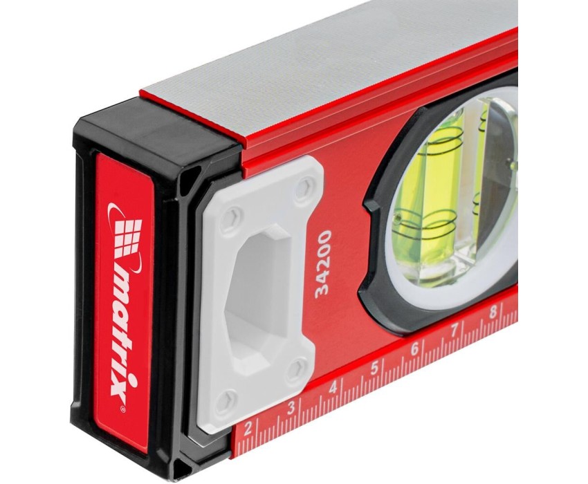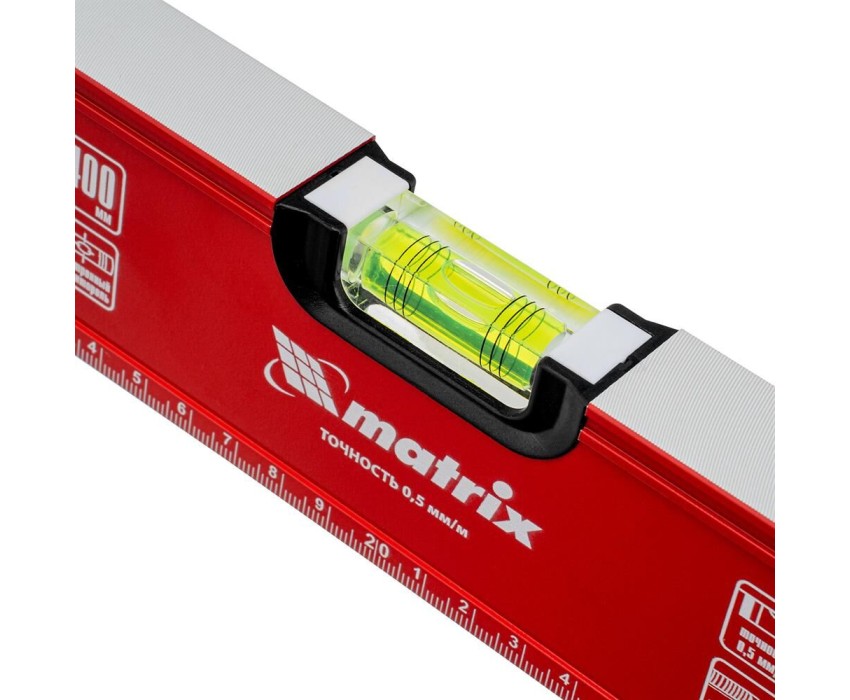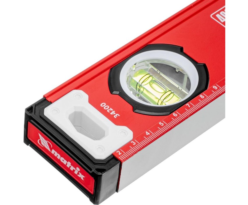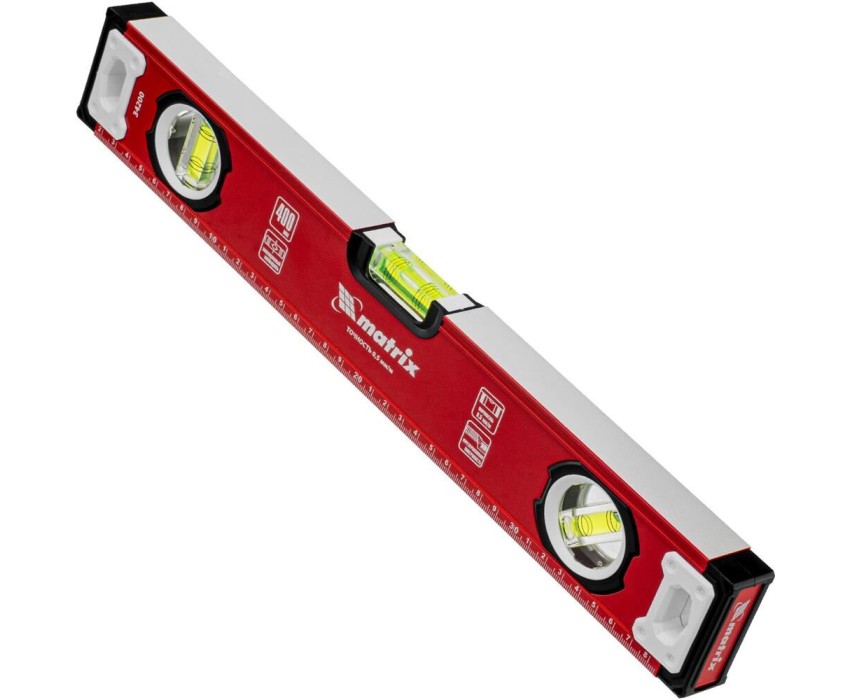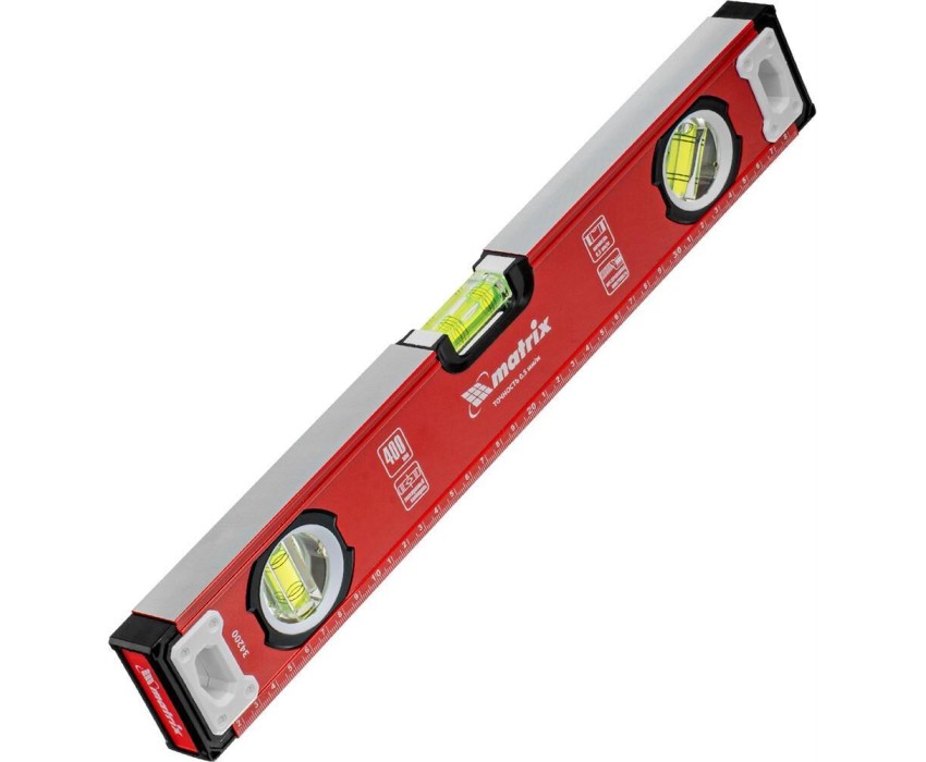 Уровень алюминиевый фрезерованный Matrix 34200 длиной 400 мм, с 3 глазками, предназначен для определения отклонений от горизонтальной и вертикальной поверхностей и угла 45°. Обеспечивает высокую точность полученных результатов, пригодится для выполнения строительных и отделочных работ. Преимущества Высокий показатель прочности — уровень изготовлен из алюминиевого профиля. Точные результаты — глазки прошли электронную калибровку на заводе, рабочая поверхность фрезерована, что позволило снизить погрешность до 0,5мм/м. Удобная работа с металлическими поверхностями — для фиксации инструмента предусмотрены встроенные магниты. Дополнительные возможности — измерительная шкала позволяет определить размер предметов, заготовок и т. д.