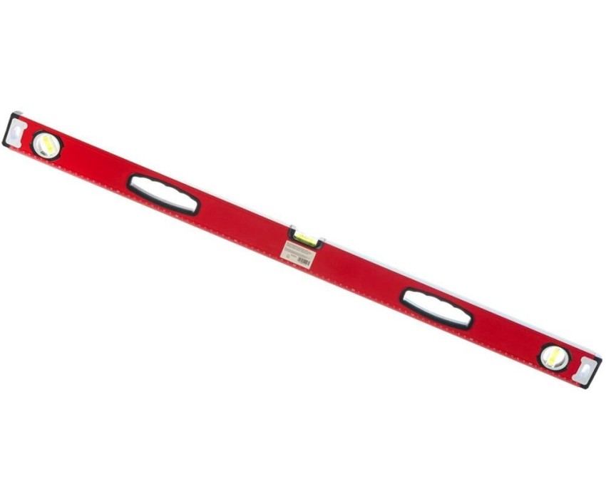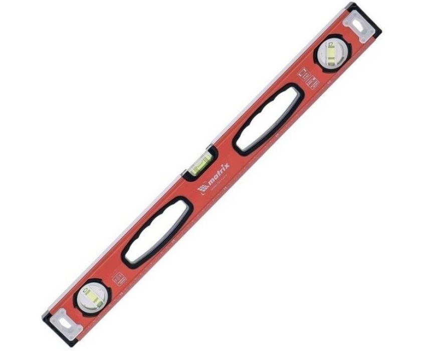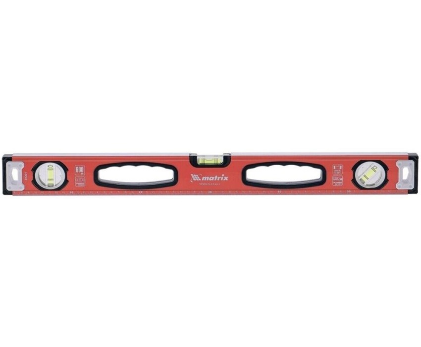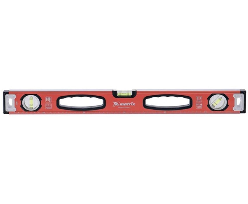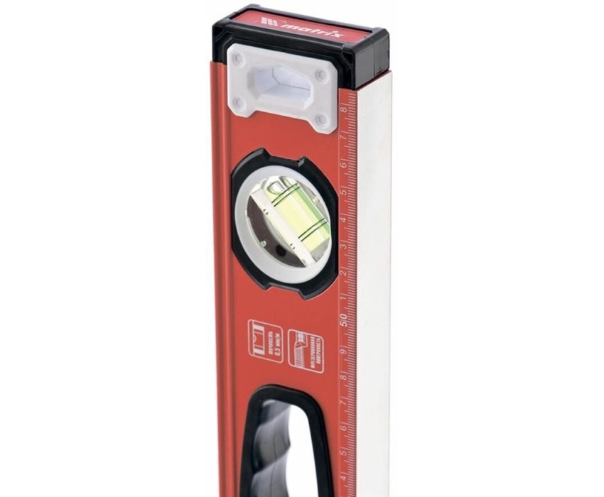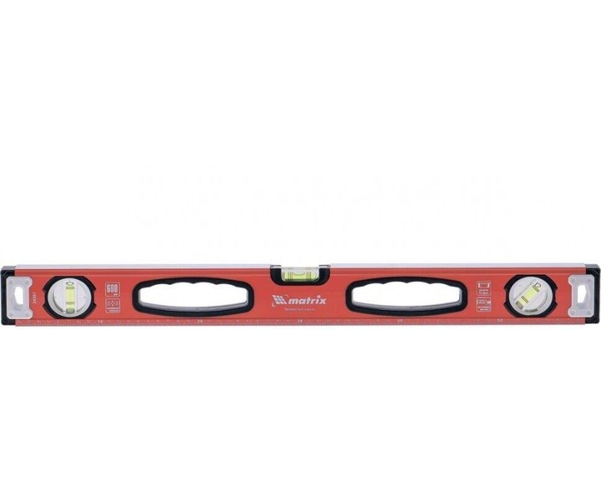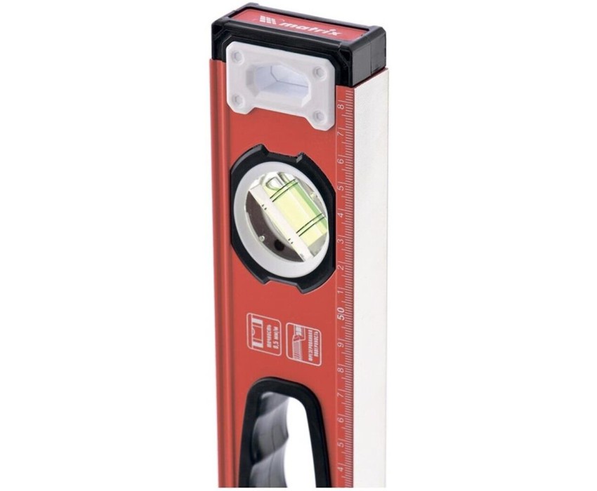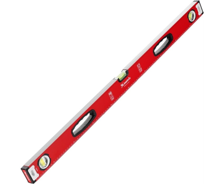 Алюминиевый фрезерованный уровень Matrix 34203 длиной 1000 мм, с 3 глазками и рукоятками, позволяет обнаружить отклонения от вертикали и горизонтали, а также выставить диагональ. Инструмент будет полезен на строительной площадке, при выполнении ремонтных и монтажных работ. Преимущества Надежность — уровень изготовлен из алюминиевого профиля, колбы установлены с использованием электронной калибровки. Высокая точность выполняемых работ — рабочая поверхность фрезерована для снижения погрешности измерений. Эргономичность — благодаря отверстиям в корпусе инструмент удобно удерживать. Использование в качестве линейки — на корпус нанесена измерительная шкала. Для определения отклонения вертикали 90° необходимо использовать пузырьковую ампулу только в верхнем положении уровня. Только базовая поверхность (противоположная ампуле 180°) является рабочей.