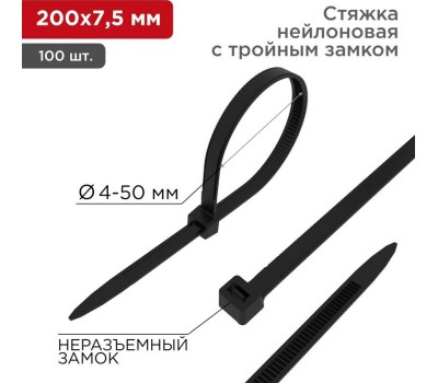 REXANT Стяжка нейлоновая Профессиональная 200x7,5мм, черная (100 шт/уп)