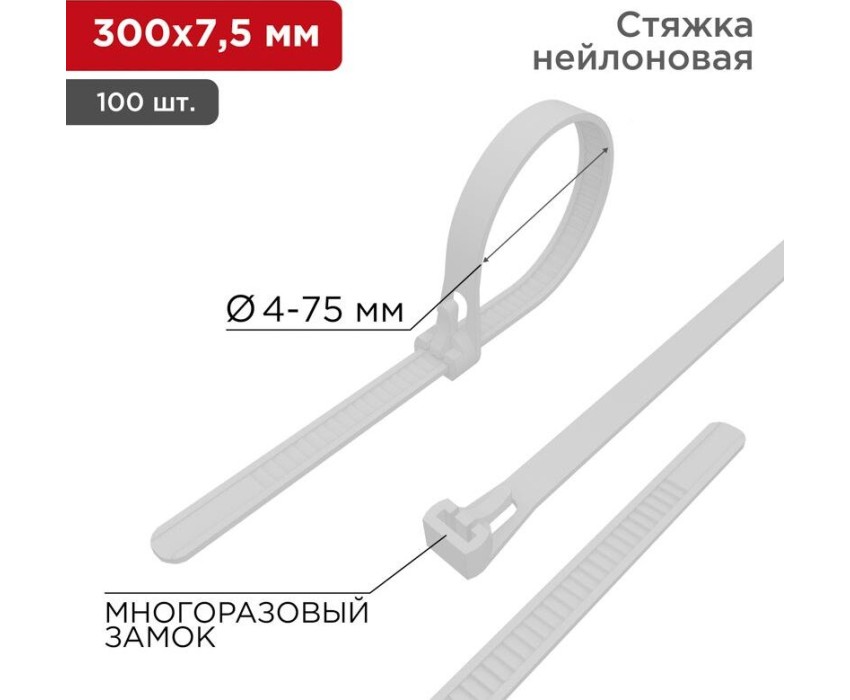 REXANT Стяжка нейлоновая многоразовая 300x7,5мм, белая (100 шт/уп)