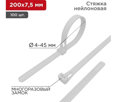 REXANT Стяжка нейлоновая многоразовая 200x7,5мм, белая (100 шт/уп)
