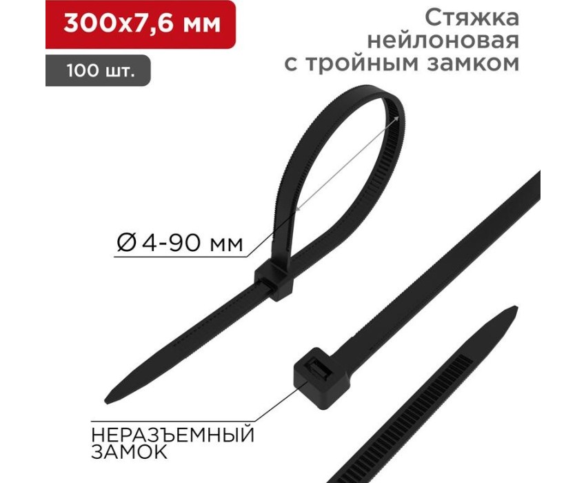 REXANT Стяжка нейлоновая Профессиональная 300x7,6мм, черная (100 шт/уп)