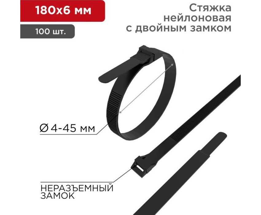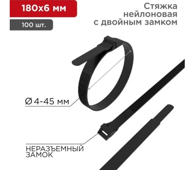 REXANT Стяжка нейлоновая для СИП с горизонтальным замком 180x6,0мм, черная (100 шт/уп)