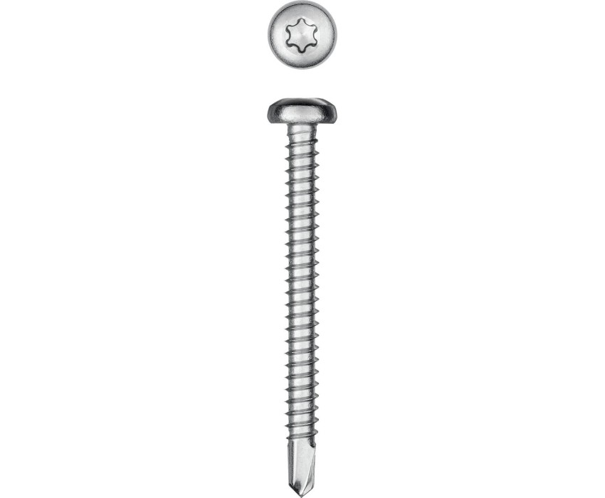 Саморезы с полукруглой головкой и сверлом изготовлены в соответствии со стандартом DIN7504N из нержавеющего прутка. Легирование никелем, хромом и марганцем полностью сохраняет аустенитную структуру кристаллической решетки, благодаря чему нержавеющие саморезы обладают хорошей прочностью и пластичностью, немагнитными свойствами и невысокой электропроводностью. Саморезы легко вкручиваются обычным шуруповертом или отверткой. Преимущества Устойчивость к воздействию неблагоприятных условий - повышенной влажности, различным агрессивным средам (в т.ч. кислотным), большим перепадам температур и т.п. Повышенная прочность и коррозионостойкость Аустенитная сталь А2 сохраняет свои прочностные свойства в широком диапазоне температур: от -200°С до +600°С, хорошо подвергается механической и термической обработке, а также сварке. Износостойкий шлиц TORX предотвращает срывание биты при закручивании и обеспечивает большой крутящий момент Полукруглая головка с плоской площадкой обеспечивает плотное прилегание конструкции к основанию и возможность использования шайбы для усиления давления на опорную поверхность Улучшенная геометрия сверла обеспечивает быстроту и легкость сверления в листовых материалах Использование Для соединения элементов конструкций из алюминия, дерева и пластика без предварительного сверления. Для соединения элементов из стали рекомендуется предварительно просверлить отверстие необходимого диаметра.