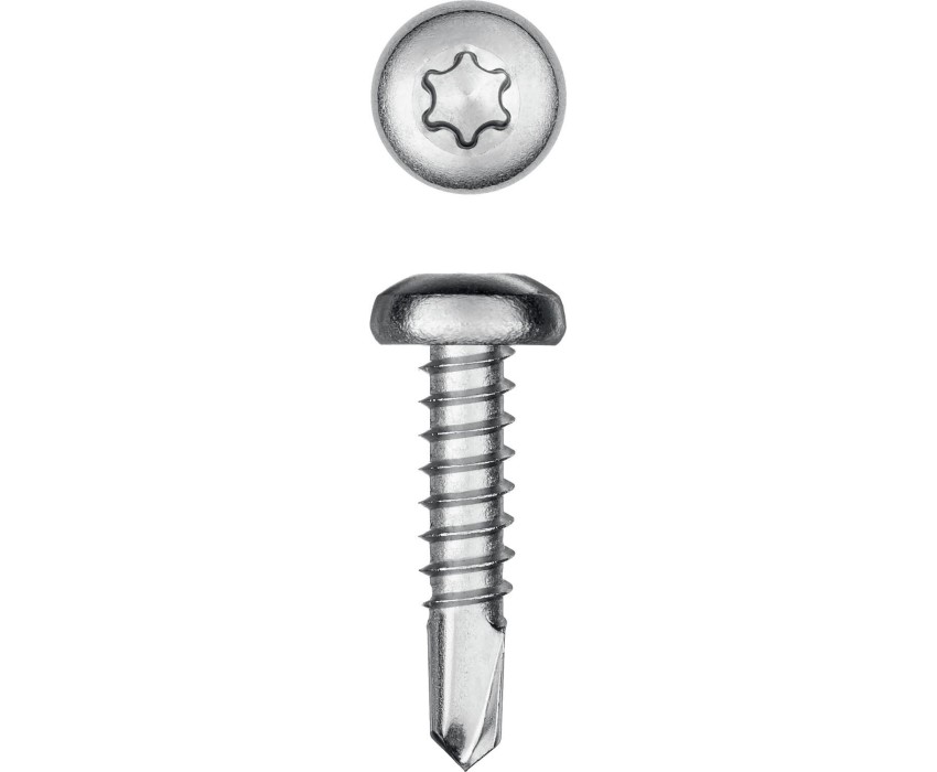 Саморезы с полукруглой головкой и сверлом изготовлены в соответствии со стандартом DIN7504N из нержавеющего прутка. Легирование никелем, хромом и марганцем полностью сохраняет аустенитную структуру кристаллической решетки, благодаря чему нержавеющие саморезы обладают хорошей прочностью и пластичностью, немагнитными свойствами и невысокой электропроводностью. Саморезы легко вкручиваются обычным шуруповертом или отверткой. Преимущества Устойчивость к воздействию неблагоприятных условий - повышенной влажности, различным агрессивным средам (в т.ч. кислотным), большим перепадам температур и т.п. Повышенная прочность и коррозионостойкость Аустенитная сталь А2 сохраняет свои прочностные свойства в широком диапазоне температур: от -200°С до +600°С, хорошо подвергается механической и термической обработке, а также сварке. Износостойкий шлиц TORX предотвращает срывание биты при закручивании и обеспечивает большой крутящий момент Полукруглая головка с плоской площадкой обеспечивает плотное прилегание конструкции к основанию и возможность использования шайбы для усиления давления на опорную поверхность Улучшенная геометрия сверла обеспечивает быстроту и легкость сверления в листовых материалах Использование Для соединения элементов конструкций из алюминия, дерева и пластика без предварительного сверления. Для соединения элементов из стали рекомендуется предварительно просверлить отверстие необходимого диаметра.