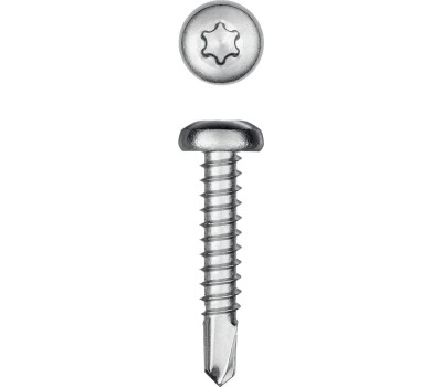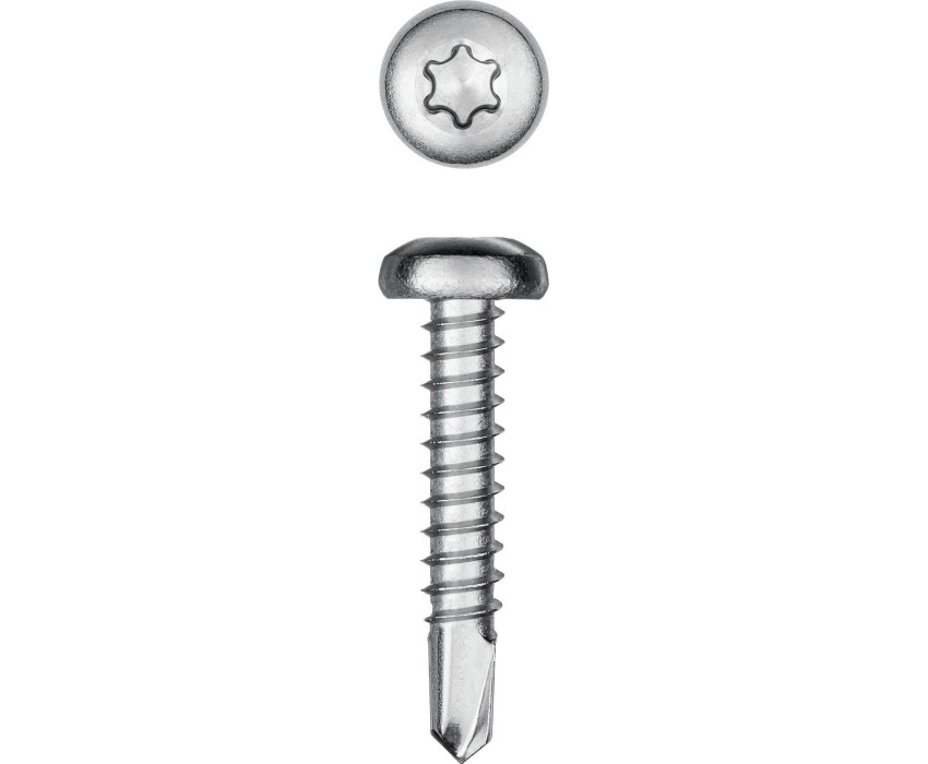 Саморезы с полукруглой головкой и сверлом изготовлены в соответствии со стандартом DIN7504N из нержавеющего прутка. Легирование никелем, хромом и марганцем полностью сохраняет аустенитную структуру кристаллической решетки, благодаря чему нержавеющие саморезы обладают хорошей прочностью и пластичностью, немагнитными свойствами и невысокой электропроводностью. Саморезы легко вкручиваются обычным шуруповертом или отверткой. Преимущества Устойчивость к воздействию неблагоприятных условий - повышенной влажности, различным агрессивным средам (в т.ч. кислотным), большим перепадам температур и т.п. Повышенная прочность и коррозионостойкость Аустенитная сталь А2 сохраняет свои прочностные свойства в широком диапазоне температур: от -200°С до +600°С, хорошо подвергается механической и термической обработке, а также сварке. Износостойкий шлиц TORX предотвращает срывание биты при закручивании и обеспечивает большой крутящий момент Полукруглая головка с плоской площадкой обеспечивает плотное прилегание конструкции к основанию и возможность использования шайбы для усиления давления на опорную поверхность Улучшенная геометрия сверла обеспечивает быстроту и легкость сверления в листовых материалах Использование Для соединения элементов конструкций из алюминия, дерева и пластика без предварительного сверления. Для соединения элементов из стали рекомендуется предварительно просверлить отверстие необходимого диаметра.