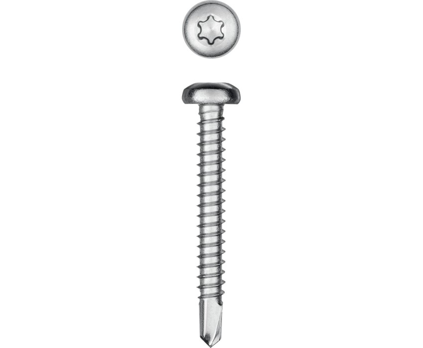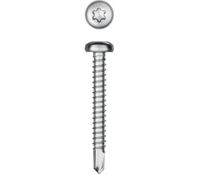 Саморезы с полукруглой головкой и сверлом изготовлены в соответствии со стандартом DIN7504N из нержавеющего прутка. Легирование никелем, хромом и марганцем полностью сохраняет аустенитную структуру кристаллической решетки, благодаря чему нержавеющие саморезы обладают хорошей прочностью и пластичностью, немагнитными свойствами и невысокой электропроводностью. Саморезы легко вкручиваются обычным шуруповертом или отверткой. Преимущества Устойчивость к воздействию неблагоприятных условий - повышенной влажности, различным агрессивным средам (в т.ч. кислотным), большим перепадам температур и т.п. Повышенная прочность и коррозионостойкость Аустенитная сталь А2 сохраняет свои прочностные свойства в широком диапазоне температур: от -200°С до +600°С, хорошо подвергается механической и термической обработке, а также сварке. Износостойкий шлиц TORX предотвращает срывание биты при закручивании и обеспечивает большой крутящий момент Полукруглая головка с плоской площадкой обеспечивает плотное прилегание конструкции к основанию и возможность использования шайбы для усиления давления на опорную поверхность Улучшенная геометрия сверла обеспечивает быстроту и легкость сверления в листовых материалах Использование Для соединения элементов конструкций из алюминия, дерева и пластика без предварительного сверления. Для соединения элементов из стали рекомендуется предварительно просверлить отверстие необходимого диаметра.
