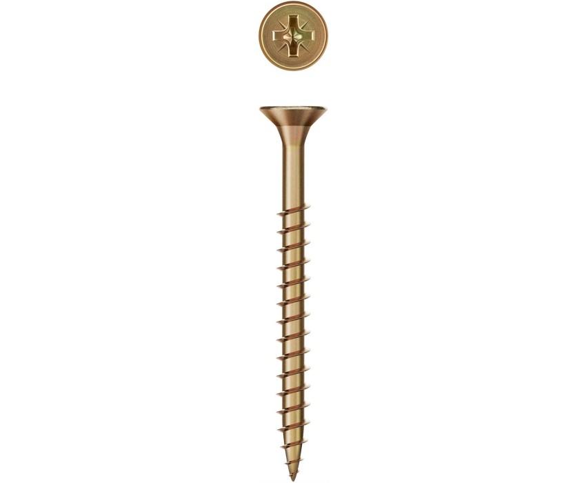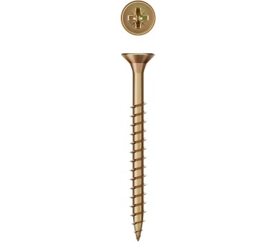Саморезы универсальные изготовлены из стального прутка с высоким содержанием углерода. Контроль за геометрией самореза начинается с калибровки прутка и заканчивается тщательной проверкой размеров готового изделия. Нормативная твердость стали достигается термической обработкой. Поверхностная твердость 550-800HV, твердость в сердцевине мин. 320HV. Саморезы легко вкручиваются обычным шуруповертом или отверткой. Предварительное сверление в скрепляемых материалах не требуется. Преимущества Двойная потайная головка утапливается в древесине, что придает конструкции эстетический вид Желтое цинковое покрытие надежно защищает от коррозии Использование Для крепления деревянных конструкций. При работе с твердыми породами дерева (дуб, бук и т.п.) необходимо предварительное сверление.