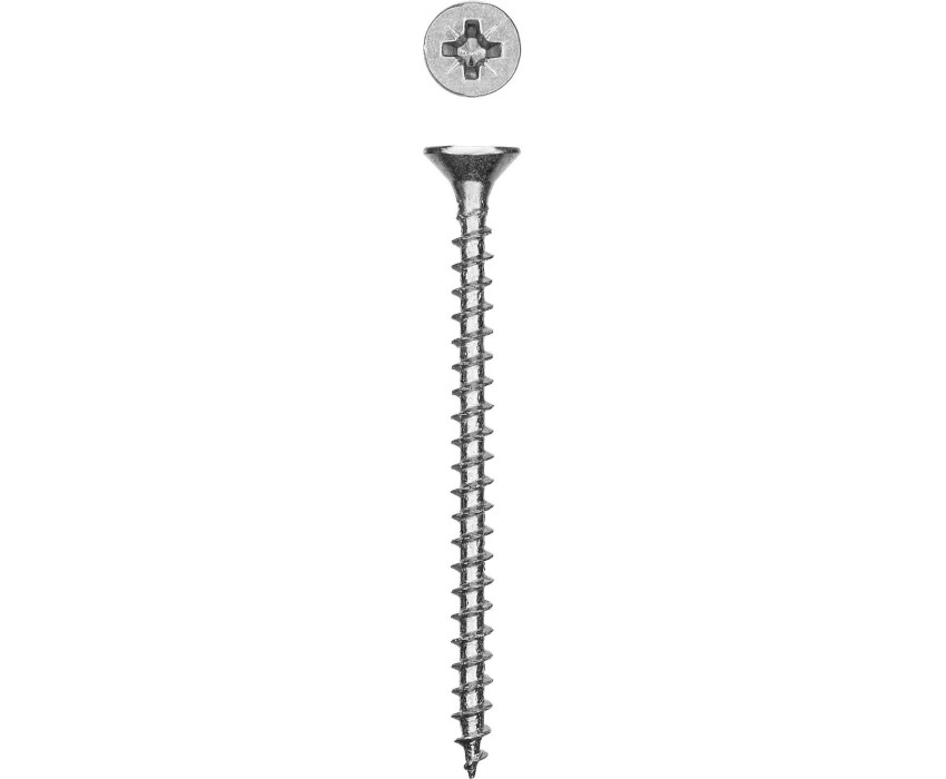 Саморезы универсальные изготовлены из стального прутка с высоким содержанием углерода. Контроль за геометрией самореза начинается с калибровки прутка и заканчивается тщательной проверкой размеров готового изделия. Нормативная твердость стали достигается термической обработкой. Поверхностная твердость 550-800HV, твердость в сердцевине мин. 320HV. Саморезы легко вкручиваются обычным шуруповертом или отверткой. Предварительное сверление в скрепляемых материалах не требуется. Преимущества Двойная потайная головка утапливается в древесине, что придает конструкции эстетический вид Цинковое покрытие надежно защищает от коррозии Использование Для крепления деревянных конструкций. При работе с твердыми породами дерева (дуб, бук и т.п.) необходимо предварительное сверление.