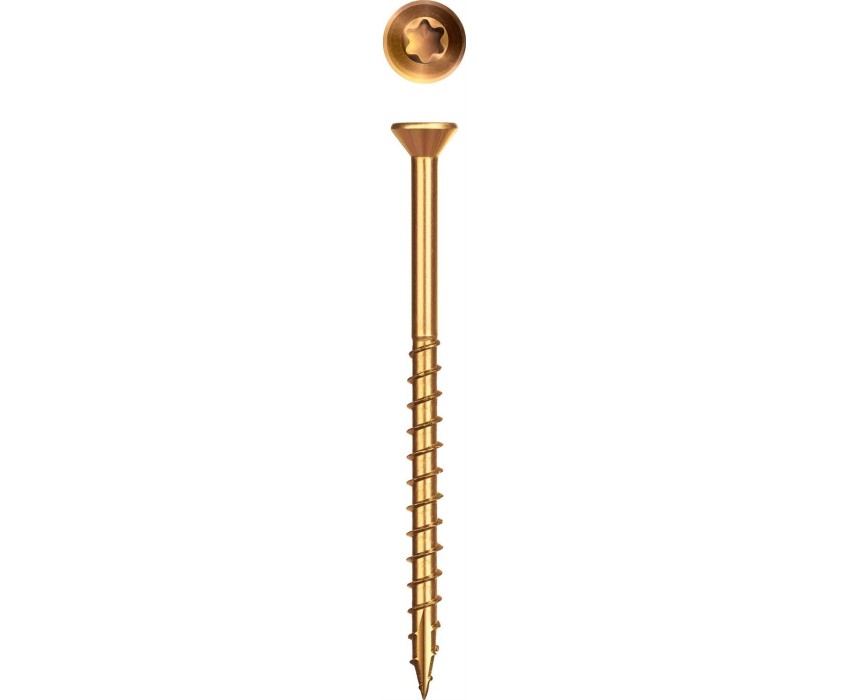 Конструкционные саморезы обладают высокой прочностью и пластичностью, благодаря чему не разрушаются при деформациях и изгибе. Режущая кромка на острие и точная геометрия резьбы значительно облегчают вкручивание самореза и предотвращают растрескивание древесины. Преимущества Режущая кромка на острие рассверливает древесину без предварительного сверления, не допуская ее расщепления, что особенно важно при работе близко к краям. Износостойкий шлиц TORX предотвращает срывание биты при закручивании и обеспечивает большой крутящий момент. Уменьшенная потайная головка утапливается в древесине, что придает конструкции более эстетический вид Желтое цинковое покрытие надежно защищает от коррозии Использование Для крепления напольных покрытий к деревянным основаниям