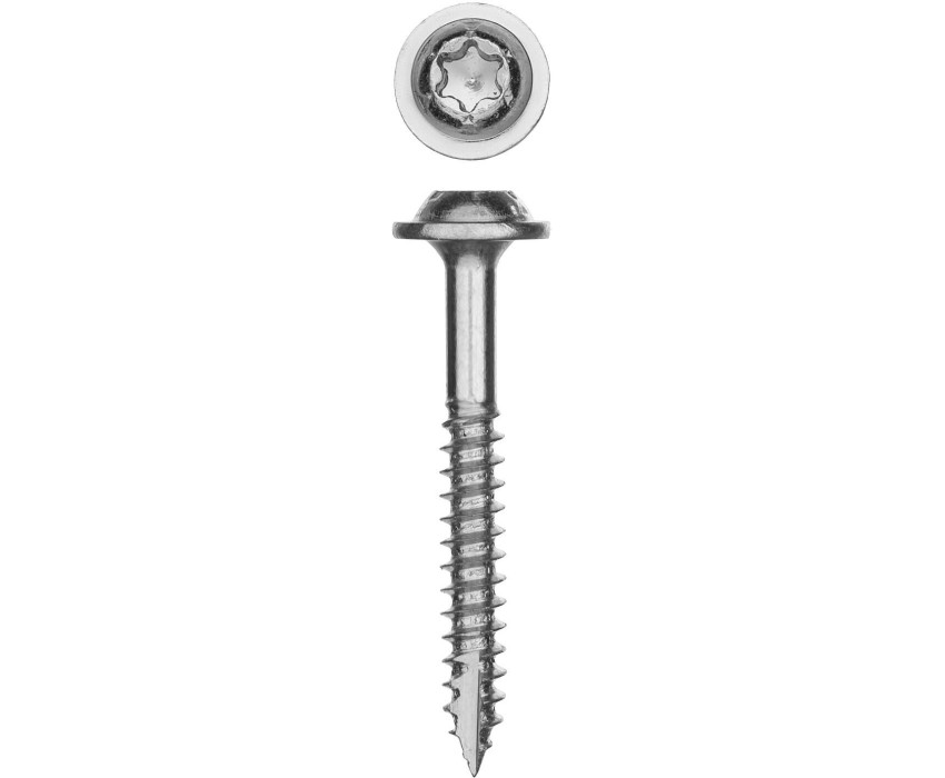 Саморезы с увеличенной сферической головкой и прессшайбой специально разработаны для соединения деталей через глухие отверстий. Изготовлены из стального прутка с высоким содержанием углерода. Контроль за геометрией самореза начинается с калибровки прутка и заканчивается тщательной проверкой размеров готового изделия. Нормативная твердость стали достигается термической обработкой. Преимущества Сферическая головка с пресс-шайбой плотно прилегает к опорной поверхности внутри глухого отверстия Частая резьба оптимальна для крепления деревянных деталей из твердых пород дерева, обеспечивая максимально прочное соединение Износостойкий шлиц ТХ20 предотвращает срывание биты при закручивании и обеспечивает большой крутящий момент Режущая кромка на острие рассверливает древесину, не допуская ее расщепления Цинковое покрытие надежно защищает изделие от коррозии Использование Для соединения деревянных деталей через глухие отверстия. Сверление отверстий производится с помощью кондуктора и ступенчатого сверла.