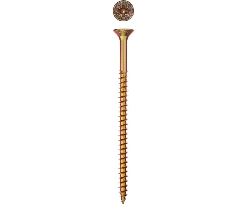 Саморезы универсальные изготовлены из стального прутка с высоким содержанием углерода. Контроль за геометрией самореза начинается с калибровки прутка и заканчивается тщательной проверкой размеров готового изделия. Нормативная твердость стали достигается термической обработкой. Поверхностная твердость 550-800HV, твердость в сердцевине мин. 320HV. Саморезы легко вкручиваются обычным шуруповертом или отверткой. Предварительное сверление в скрепляемых материалах не требуется. Преимущества Двойная потайная головка утапливается в древесине, что придает конструкции эстетический вид Желтое цинковое покрытие надежно защищает от коррозии Использование Для крепления деревянных конструкций. При работе с твердыми породами дерева (дуб, бук и т.п.) необходимо предварительное сверление.