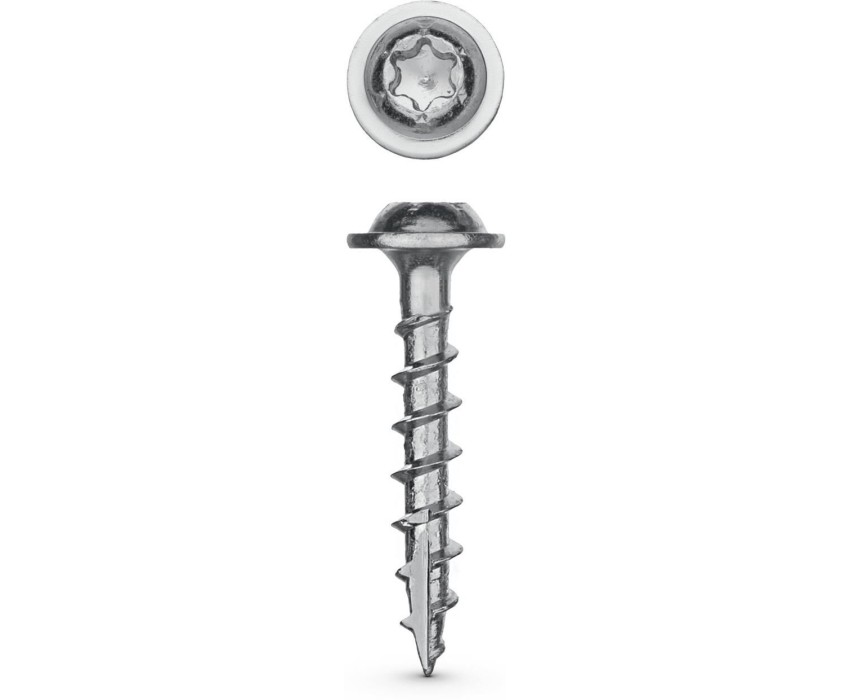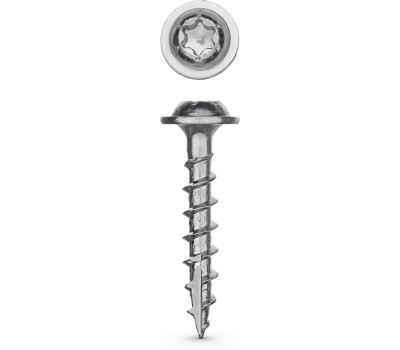 Саморезы с увеличенной сферической головкой и прессшайбой специально разработаны для соединения деталей через глухие отверстий. Изготовлены из стального прутка с высоким содержанием углерода. Контроль за геометрией самореза начинается с калибровки прутка и заканчивается тщательной проверкой размеров готового изделия. Нормативная твердость стали достигается термической обработкой. Преимущества Сферическая головка с пресс-шайбой плотно прилегает к опорной поверхности внутри глухого отверстия Редкая резьба оптимально подходит для соединения деталей из мягких пород дерева, не допуская крошения волокнистой стуктуры Износостойкий шлиц ТХ20 предотвращает срывание биты при закручивании и обеспечивает большой крутящий момент Режущая кромка на острие рассверливает древесину, не допуская ее расщепления Цинковое покрытие надежно защищает изделие от коррозии Использование Для соединения деревянных деталей через глухие отверстия. Сверление отверстий производится с помощью кондуктора и ступенчатого сверла.
