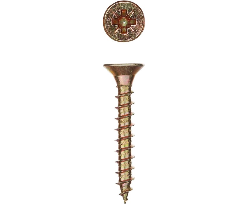 Саморезы универсальные изготовлены из стального прутка с высоким содержанием углерода. Контроль за геометрией самореза начинается с калибровки прутка и заканчивается тщательной проверкой размеров готового изделия. Нормативная твердость стали достигается термической обработкой. Поверхностная твердость 550-800HV, твердость в сердцевине мин. 320HV. Саморезы легко вкручиваются обычным шуруповертом или отверткой. Предварительное сверление в скрепляемых материалах не требуется. Преимущества Двойная потайная головка утапливается в древесине, что придает конструкции эстетический вид Желтое цинковое покрытие надежно защищает от коррозии Использование Для крепления деревянных конструкций. При работе с твердыми породами дерева (дуб, бук и т.п.) необходимо предварительное сверление.