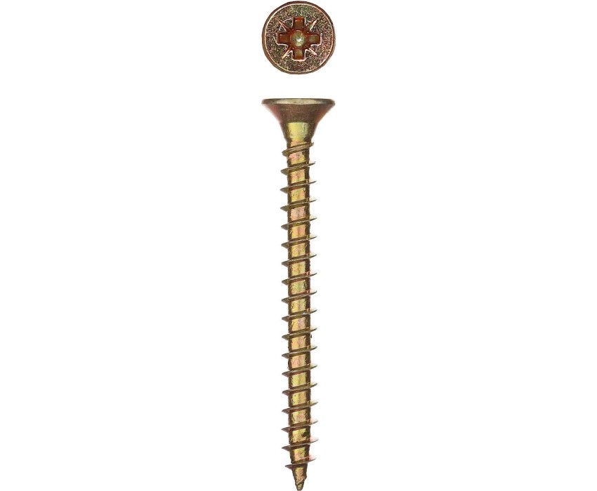 Саморезы универсальные изготовлены из стального прутка с высоким содержанием углерода. Контроль за геометрией самореза начинается с калибровки прутка и заканчивается тщательной проверкой размеров готового изделия. Нормативная твердость стали достигается термической обработкой. Поверхностная твердость 550-800HV, твердость в сердцевине мин. 320HV. Саморезы легко вкручиваются обычным шуруповертом или отверткой. Предварительное сверление в скрепляемых материалах не требуется. Преимущества Двойная потайная головка утапливается в древесине, что придает конструкции эстетический вид Желтое цинковое покрытие надежно защищает от коррозии Использование Для крепления деревянных конструкций. При работе с твердыми породами дерева (дуб, бук и т.п.) необходимо предварительное сверление.