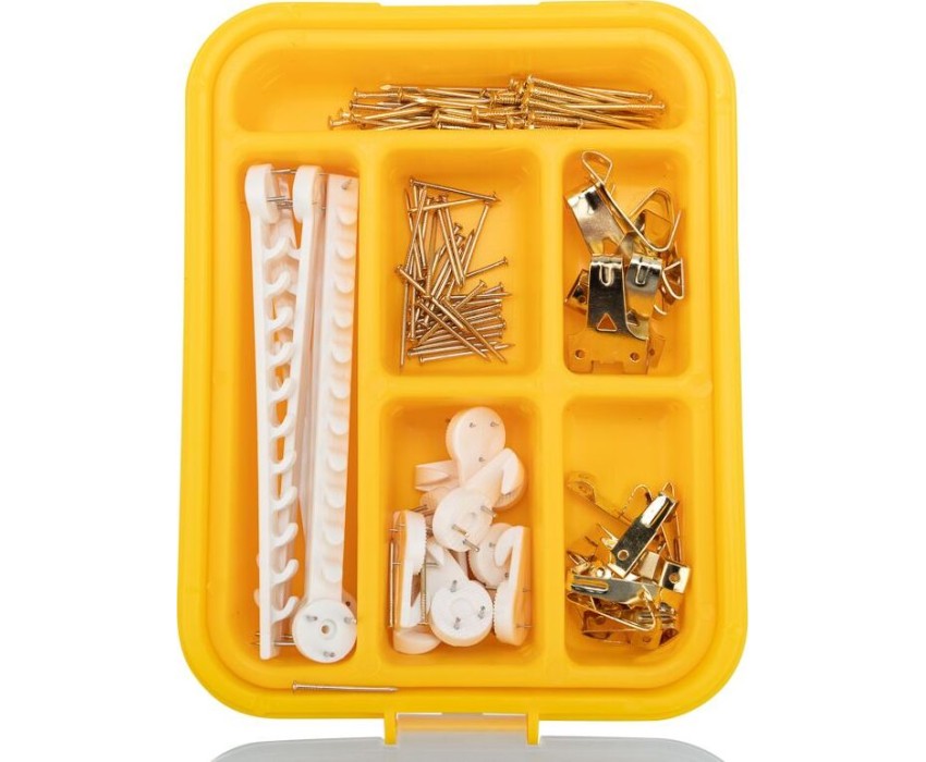 Набор для крепления картин включает в себя несколько видов крючков, которые подойдут к разным типам стен и полотнам с разным весом и размером.