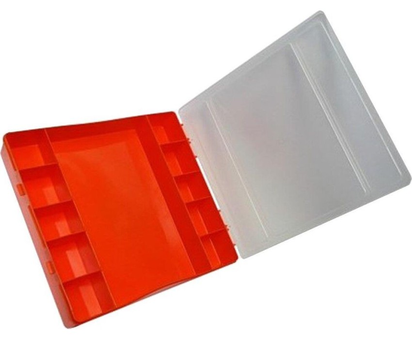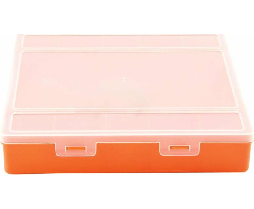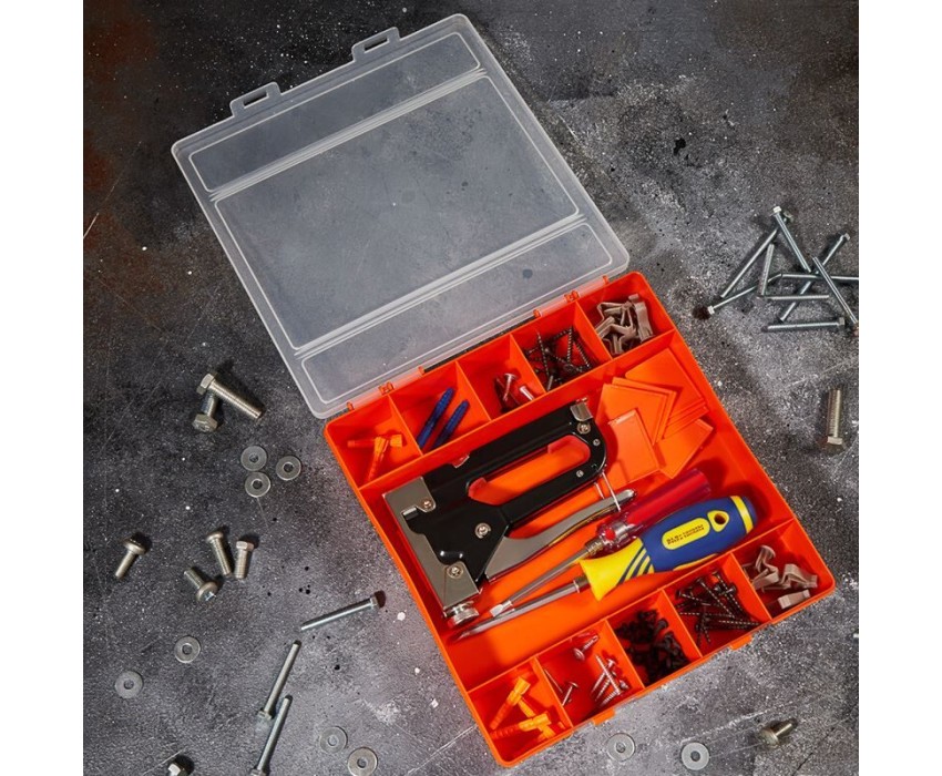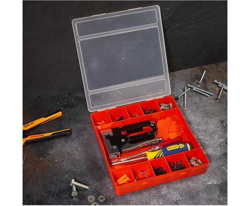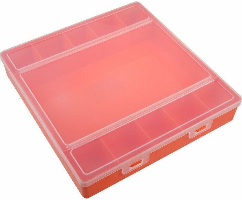 Ящик для инструментов PROconnect выполнен из прочного пластика. Обладает 1 длинным отделением и 10 небольшими отсеками для мелких принадлежностей. Функциональный ящик предназначен для хранения и транспортировки инструментов, крепежных изделий, расходных материалов, в том числе различных предметов, схожих по габаритам. Удобные замки плотно прижимают крышку к корпусу; открываются и закрываются одной рукой. Прозрачная крышка обеспечивает дополнительное удобство при хранении. Характеристики: Размеры: 245х258х45 мм Количество отделений: 10 шт. Материал: полипропилен Цвет: оранжевый Преимущества: Полупрозрачная крышка позволяет сразу увидеть, в каком отсеке находятся необходимые предметы Подходит для домашнего и профессионального использования Выполнен из прочных долговечных материалов