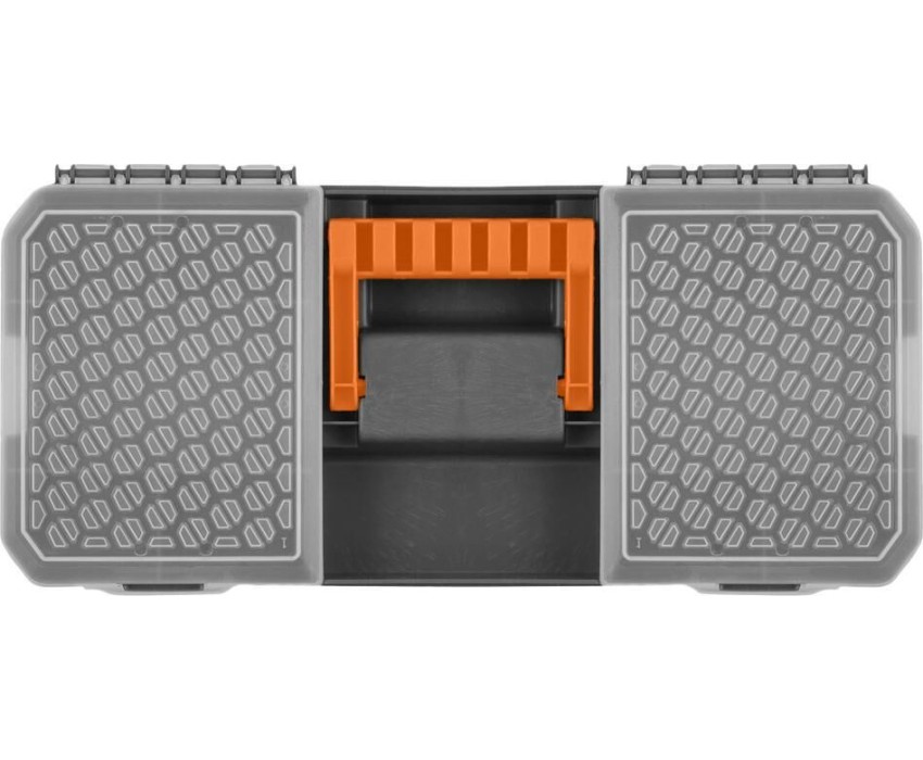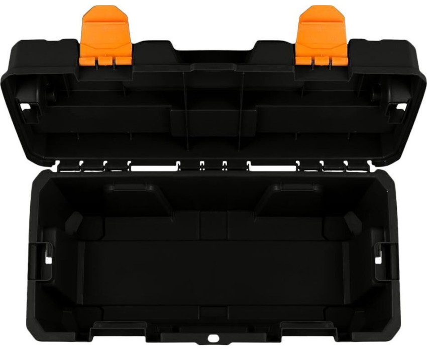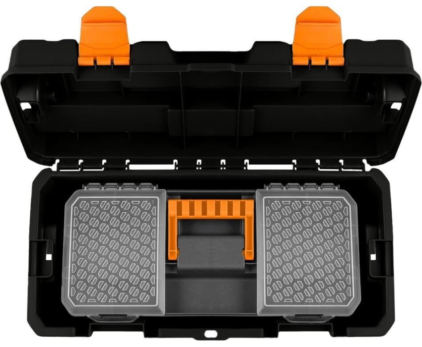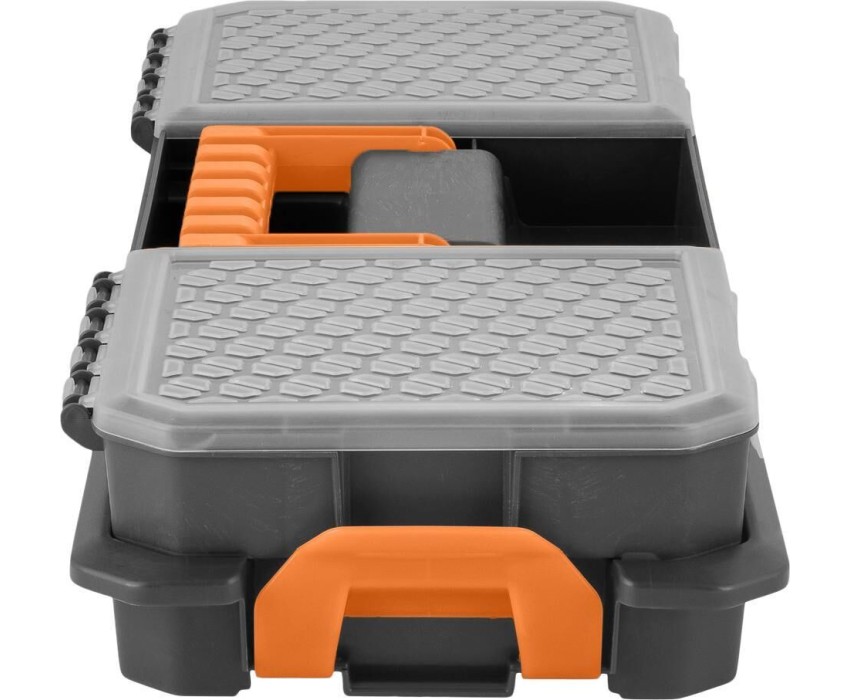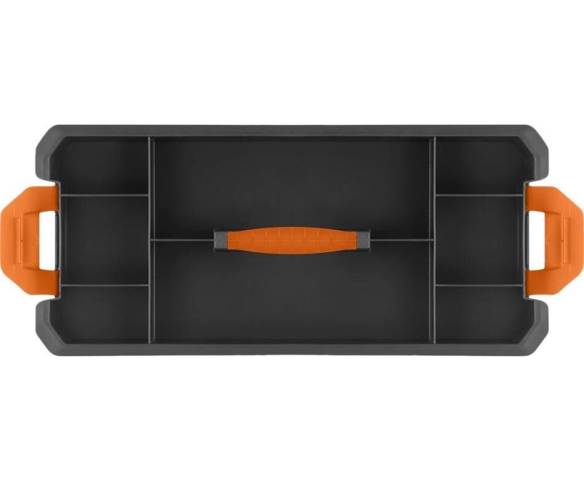 Ящик для инструментов помогает содержать в порядке и быстро находить необходимые инструменты и аксессуары. Идеален для использования дома, на даче, в гараже, мастерской, в автомобиле. Хранение инструментов в ящике защищает их от пыли и грязи. Ручка-замок – это отличное решение для мастеров, которым необходимо часто перемещаться в процессе выполнения работ. В поднятом состоянии ручка надёжно фиксирует крышку ящика, избавляя от необходимости закрывать защёлки. Длинная ручка равномерно распределяет вес ящика и обеспечивает комфорт при переноске. Крышка оснащена ложементом для распила материалов и линейкой для быстрого подбора метизов необходимого размера. Съёмный внутренний лоток с органайзером позволяет отделить инструменты и аксессуары первой необходимости от основного отсека. Возможность использования навесного замка защитит содержимое от свободного доступа, в том числе обеспечит безопасность детей.