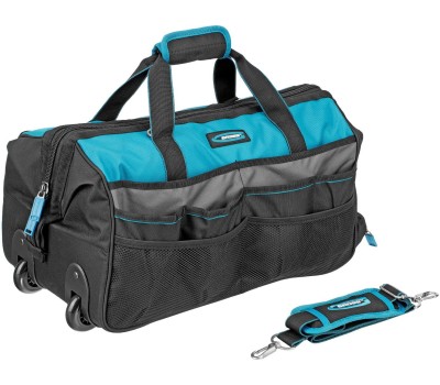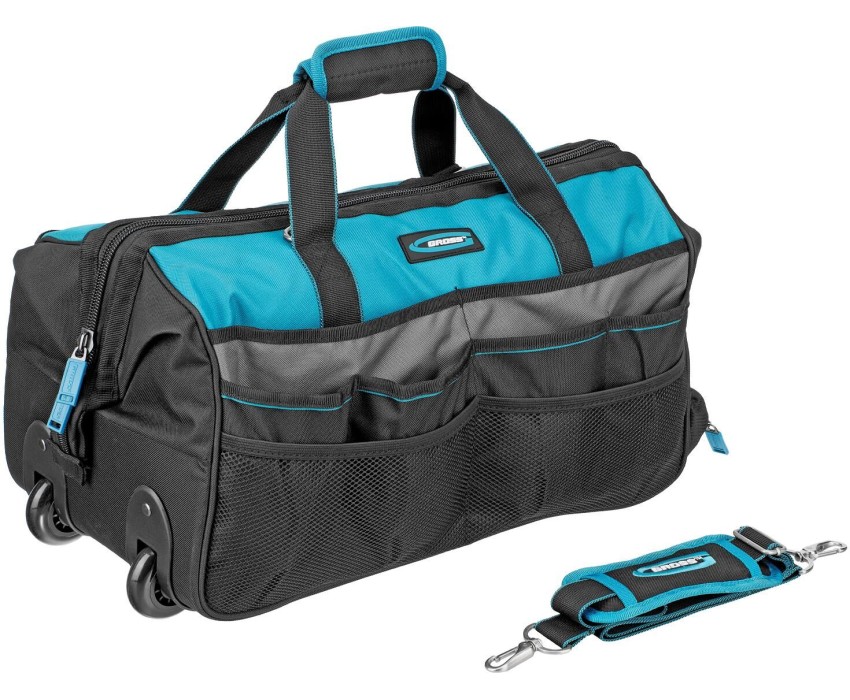 Сумка Gross 90276 габаритами 500 х 280 х 290 мм, с выдвижной рукояткой, колесами и наплечным ремнем, удобна для хранения и транспортировки инструментов, оснастки, крепежа и расходных материалов. Будет полезна автовладельцу, сантехнику, монтажнику, слесарю, пригодится дома, на даче и в гараже. Преимущества Прочность и долговечность — прочный полиэстер 600 D не рвется и не протирается со временем. 29 карманов — сумка позволяет организовать упорядоченное хранение инструментов разного размера. Комфортное перемещение — сумка снабжена выдвижной телескопической ручкой и колесами, а также регулируемым наплечным ремнем с широкой накладкой.