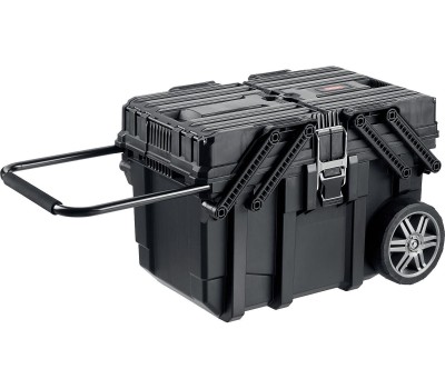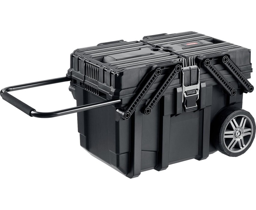 Модель имеет три отсека - два верхних маленьких и один большой нижний. Один из верхних отсеков разделен на шесть ячеек для хранения мелких элементов. Колеса прорезинены и устойчивы на любой поверхности. Преимущества Система полного раскрытия - для удобного доступа ко всему содержимому, большие обрезиненные колёса. Использование Применяется для хранения инструментов и принадлежностей