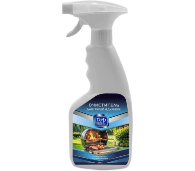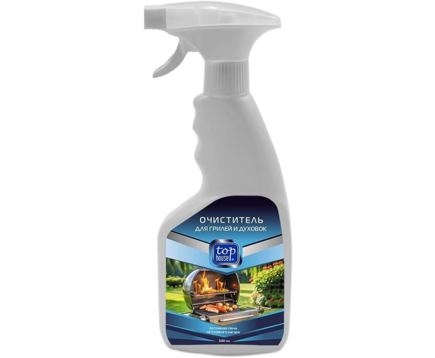 TOP HOUSE Очиститель нагара и стойких загрязнений, 500 мл Высокощелочное средство для удаления жира, копоти и нагара с грилей, барбекю, шампуров, жаровен, духовок, противней и варочных поверхностей. Активная пена дольше остается на вертикальной поверхности.