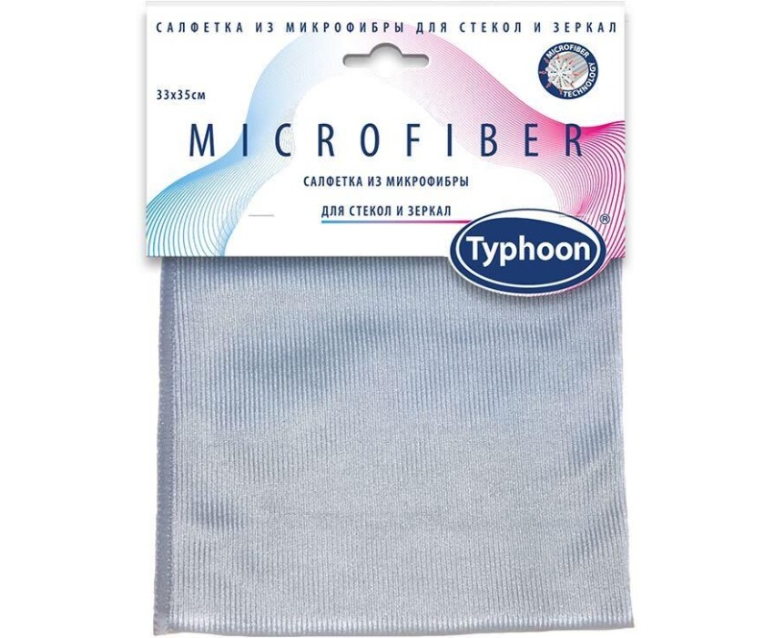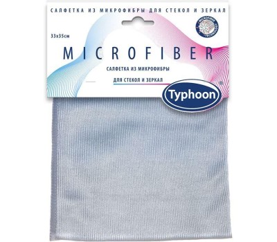 ТАЙФУН Салфетка из микрофибры для стекол и зеркал, 33х35 cм. Эффективно удаляет загрязнения, в том числе пятна и отпечатки пальцев. Придает блеск зеркальным поверхностям, оконным стеклам, стеклянным столам и кафельной плитке. Не требует применения моющих и чистящих средств. Обладает повышенной прочностью. Подходит для сухой и влажной уборки. Не повреждает поверхности. Не оставляет разводов и ворсинок. Долговечна в использовании.