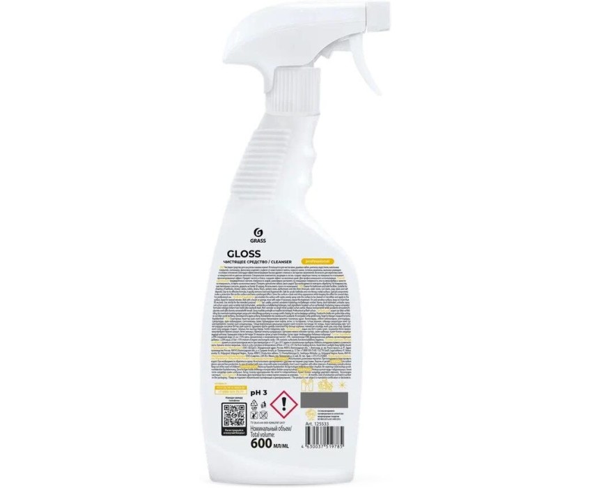 Чистящее средство для сан.узлов Глосс "Gloss Professional" (флакон 600 мл) Состав: ≥30% очищенная вода; ≥5, но <15% смесь органических и неорганических кислот; <5%: неионогенные ПАВ, функциональные добавки, ароматизирующая добавка. Способ применения: предварительно смочить поверхность водой, равномерно распылить на очищаемую поверхность или на микрофибру и нанести на поверхность, оставить на несколько минут. Потереть щеткой или губкой, смыть водой. При необходимости повторить обработку. На поверхностях, чувствительных к кислоте, держать не более 30 секунд. Использовать строго по назначению