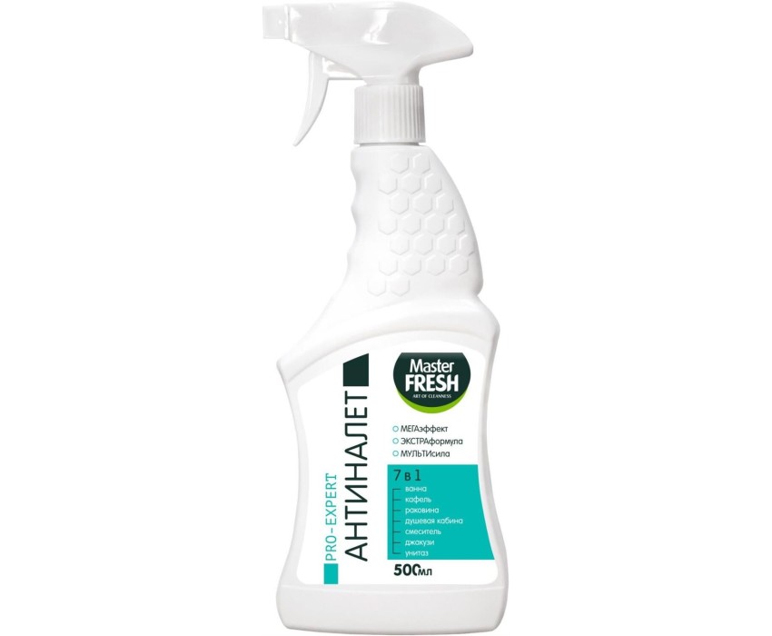 Master Fresh Чистящее средство для ванн Антиналет Pro-Expert 500мл Профессиональное чистящее средство, созданное специально для ухода за сантехникой и поверхностями в ванной комнате. Благодаря уникальной формуле, оно эффективно борется с самыми распространенными загрязнениями, возвращая вашим предметам интерьера первозданный вид. Средство разработано с учетом особенностей различных материалов. Оно идеально подходит для чистки эмалированных и акриловых ванн, душевых кабин, кафельной плитки, фаянсовых изделий (раковин, унитазов, биде), а также пластиковых поверхностей. При регулярном использовании продукт не только удаляет загрязнения, но и создает защитный слой, препятствующий образованию новых отложений. Мощная формула средства легко справляется с известковым налетом, мыльными разводами, ржавчиной и въевшейся грязью. Особая технология также эффективно устраняет неприятные запахи, создавая в ванной комнате ощущение свежести и чистоты.