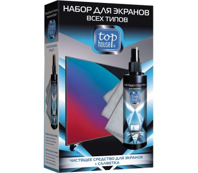 TOP HOUSE Набор для PLASMA, TFT, LCD и ЖК ЭКРАНОВ, 2 предмета (Специальный очиститель экранов, 250 мл. + Салфетка для ухода за PLASMA, LCD, TFT и ЖК экранами). Разработан и произведен в Германии по современной технологии с учетом рекомендаций ведущих производителей аудио-видео техники, оргтехники и цифровых устройств. Для качественной очистки и повседневного ухода за экранами TFT и плазменных панелей, ЖК-телевизоров, LCD-мониторов, проекционных и ЭЛТ телевизоров, ноутбуков, КПК, смартфонов, коммуникаторов и цифровых фоторамок используйте Специальный очиститель TOP HOUSE совместно с входящей в набор безворсовой нетканой салфеткой PLASMA TOP HOUSE