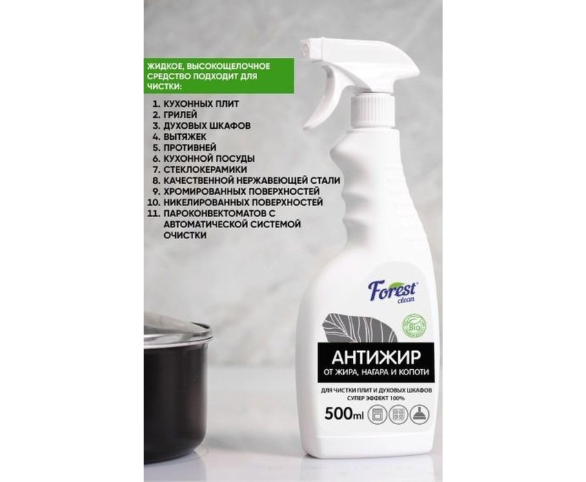 FOREST CLEAN Антижир 500 мл Жидкое высокощелочное средство для удаления жира, нагара, копоти, для ручной чистки кухонных плит, грилей, духовых шкафов, вытяжек, противней, вытяжных зонтов, фритюрниц и жарочного оборудования. Антижир / антипригар / жироудалитель эффективно очищает от пригоревших и присохших жиров, масел, сахара на стеклокерамике, качественной нержавеющей стали, хромированных, никелированных и других поверхностях. Удаляет неприятные запахи, загрязнения от нефтепродуктов. Легко смывается, не оставляя плёнок, царапин, разводов, а также препятствует повторному осаждению загрязнений. Не оставляет царапин и разводов. Удобно использовать при чистке вертикальных поверхностей. При очистки грилей, плит, жарочного оборудования, вытяжек и другого оборудования необходимо распылить средство на охлажденную поверхность и через 5-15 минут разтереть и удалить грязь губкой, смыть водой и вытереть насухо. Во время применения использовать перчатки.