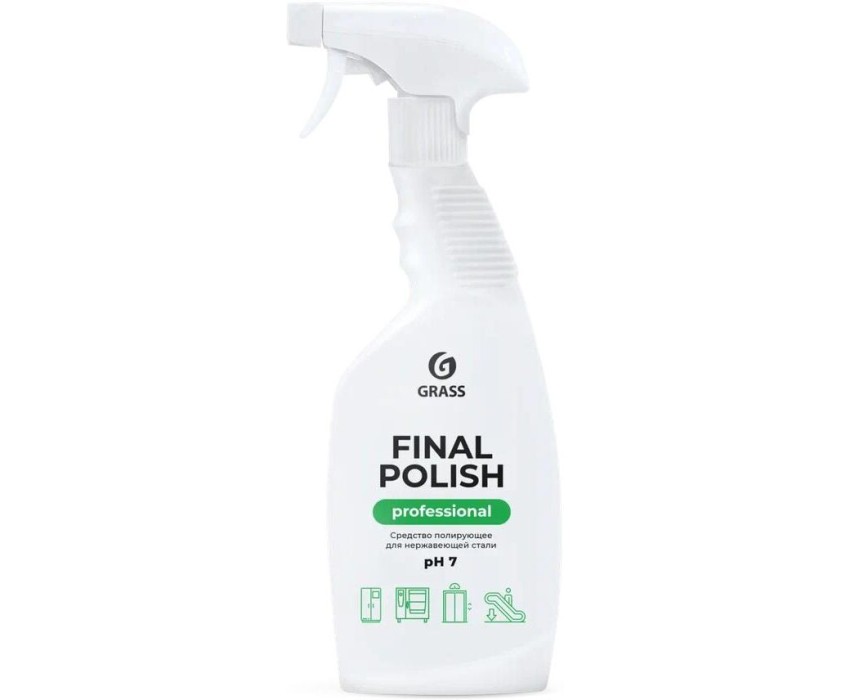 Высокоэффективное средство по уходу за металлическими поверхностями Final Polish. Предназначено для полировки, очистки и придания блеска поверхностям из нержавеющей стали, цветных металлов, а также никелированным и хромированным поверхностям. Используется для обработки наружных поверхностей пищевого технологического оборудования, в том числе холодильных камер, печей, пароконвектоматов, посудомоечных и таромоечных машин, а также лифтов, поручней, турникетов и т.д. Состав ≥30% очищенная вода, полиметилсилоксан; <5%: неионогенные ПАВ, ароматизирующая добавка, метилизотиазолинон, метилхлороизотиазолинон.