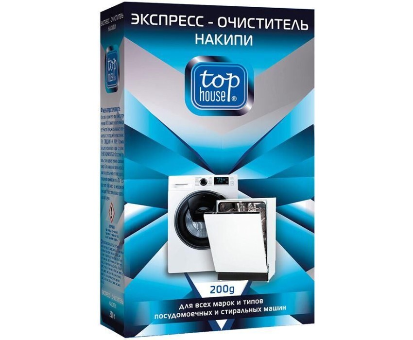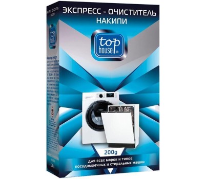 TOP HOUSE Экспресс-очиститель накипи для всех типов стиральных и посудомоечных машин, 200 г. Изготовлен по современной технологии и с учетом рекомендаций крупнейших производителей стиральных и посудомоечных машин. За одно применение полностью удаляет накипь с нагревательных элементов и внутренних деталей. Продлевает срок службы машин.