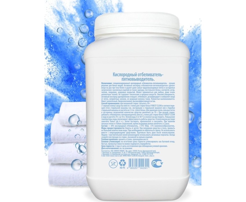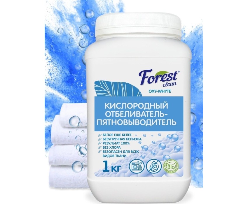 FOREST CLEAN Кислородный отбеливатель-пятновыводитель 1 кг Специализированный кислородный отбеливатель-пятновыводитель - лучшее решение для белых вещей. Активный кислород отбеливателя-пятновыводителя сделает вещи на два три тона белее и удалит даже самые трудновыводимые пятна и застарелые загрязнения с различных изделий и ткани: Одежды, постельного белья, скатертей, штор, чехлов, покрывал, ковровых покрытий. Может применяться для любых, даже очень деликатных тканей. Не содержит токсических и вредных веществ. окисляя поверхность, активный кислород одновременно очищает, отбеливает, дезинфицирует и избавляет вещи от пятен, неприятных запахов, не разрушая волокна ткани. Полностью выполаскивается. Имеет экологичный, биоразлагаемый, высокоэффективный состав.Способ применения: 1. Ручная стирка и отбеливание: На 5 л воды - Отбеливающая добавка 30 г (1 мерная ложка); 2. Автоматическая стирка и отбеливание: На 3 - 4 кг сухого белья - Отбеливающая добавка 30-70г (1-2 мерных ложек).