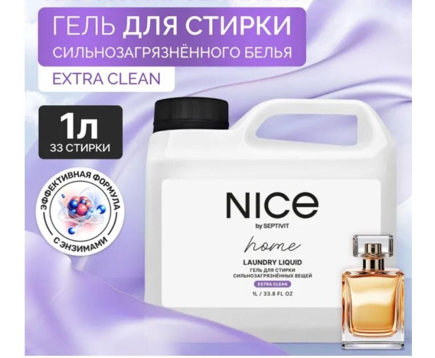 NICE by Septivit - эксперт в сфере эко продуктов для дома. Вся продукция компании разработана в собственной лаборатории SEPTIVIT: полностью безопасна для здоровья и экологии, а также не тестируется на животных. Стиральный порошок жидкий разработан специально для стирки сильнозагрязненного белья и вещей из различных видов тканей. Подходит для цветного, белого и черного белья. Усиленная форма средства с энзимами проникает глубоко в ткань и избавляет вещи от пятен и сильных загрязнений - словно эффект химчистки Гипоаллергенный состав геля без запаха безопасен для людей с чувствительной кожей, поэтому универсальный гель подходит как для взрослого, так и для детского белья. Гель концентрат 1 л нейтрализует нежелательные запахи, сохраняя только аромат чистоты. Средство для стирки 1 литр от NICE by Septivit (Найс бай Септивит) полностью вымывается из волокон, сохраняет текстуру, яркость цвета и форму ткани, и экономично расходуется благодаря объему 1л. Экогель можно использовать для машинной