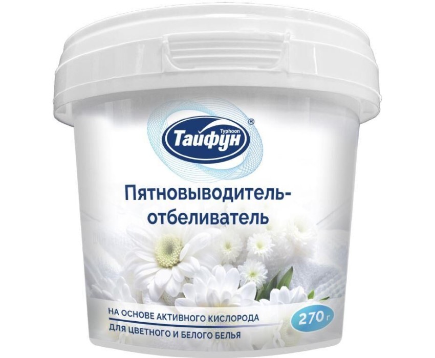 ТАЙФУН Пятновыводитель отбеливатель 270 г. это эффективное средство на основе активного кислорода и энзимного комплекса для удаления всех видов пятен и отбеливания белья. Подходит для всех видов тканей кроме шерсти и шелка. Усиливает действие всех видов средств для стирки и подходит для всех типов стиральных машин и ручной стирки. Удаляет стойкие загрязнения и неприятные запахи. Не содержит отдушек, агрессивных ПАВ, хлора.