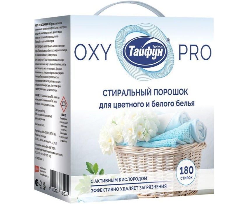 ТАЙФУН Стиральный порошок для цветного и белого белья с активным кислородом, 3,6 кг подходит для стирки как белых, так и цветных тканей из натуральных, синтетических и смесовых волокон, кроме шерсти и шелка. Может использоваться для стирки верхней одежды, курток, комбинезонов. Может использоваться в местах без централизованной системы канализации, например, за городом.