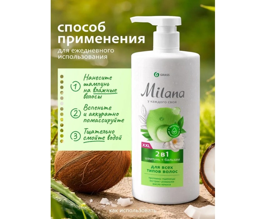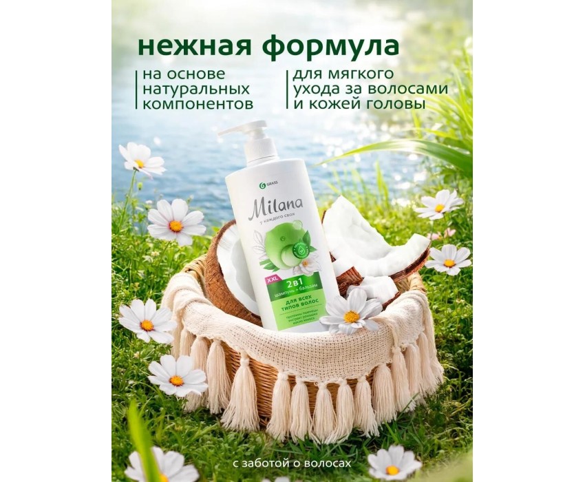 Шампунь GRASS 145141 Шампунь-бальзам для волос 2в1 "Milana" с маслом кокоса (флакон 1000мл)